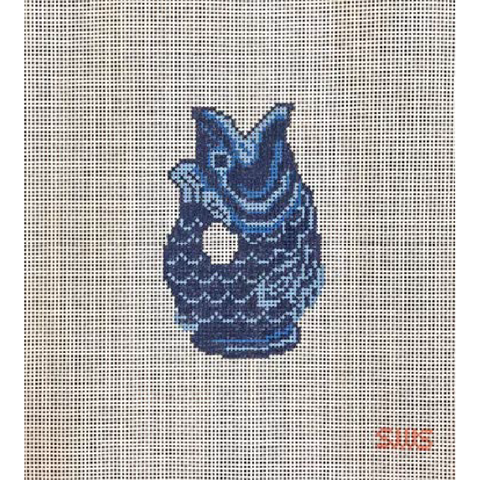 This hand painted needlepoint canvas from Stitching with Stacey features a vintage fish gurgle pot pitcher in navy blue.