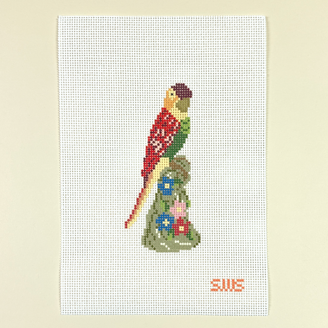This is a hand painted needlepoint canvas by Stitching with Stacey. It features a colorful bird with red wings, perched on a flower-covered tree trunk.