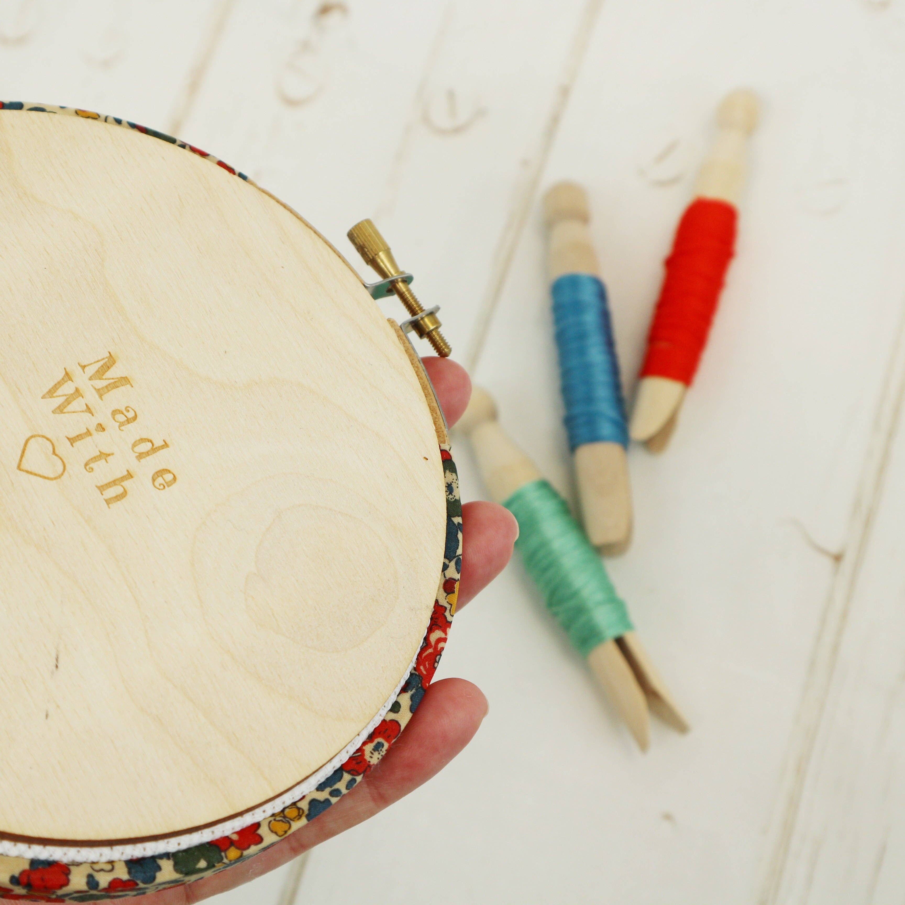 This cross stitch kit by Stitchkits Crafts features a pretty floral design. The hoop is hand-covered with colorful, Liberty of London fabric. This kit comes with a decorative embroidery hoop as well as a wooden backing disc that says Made With Love, so you can easily finish and hang your piece. The quality wooden hoop is hand wrapped in genuine Liberty's of London, 'Betsy' Tana Lawn Fabric. This beautiful fabric is the inspiration behind this design and informed the color palette. Scissors and clothespins not included.