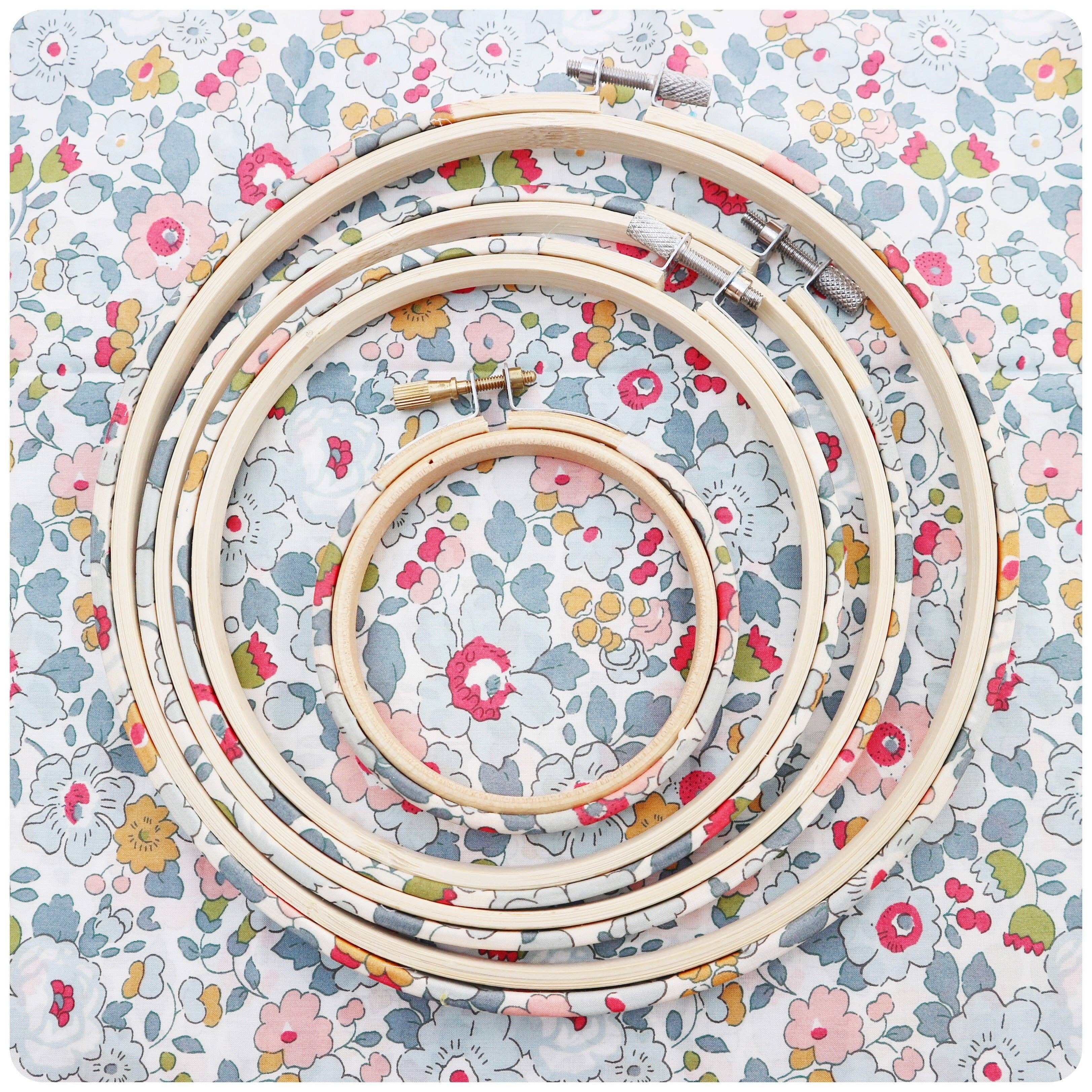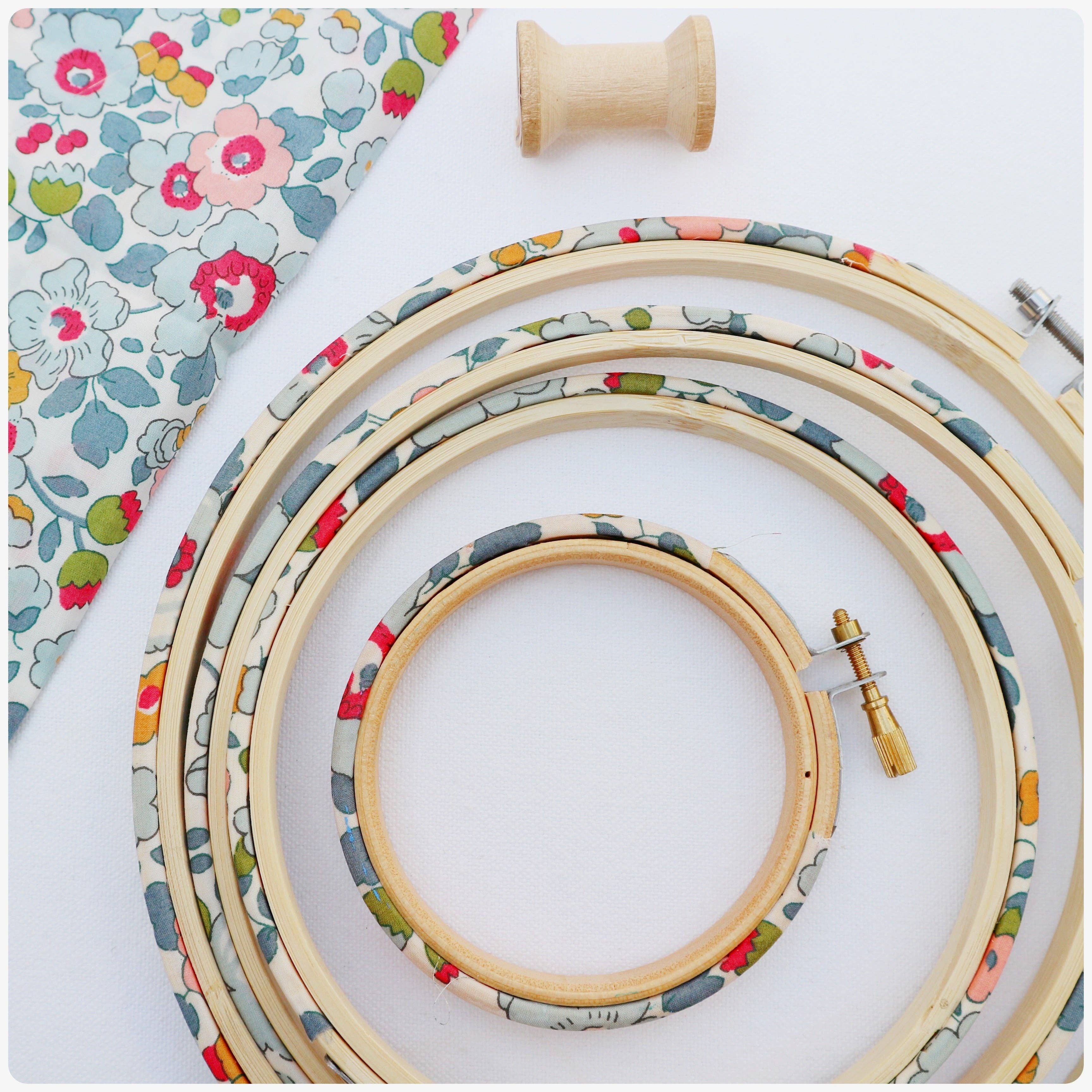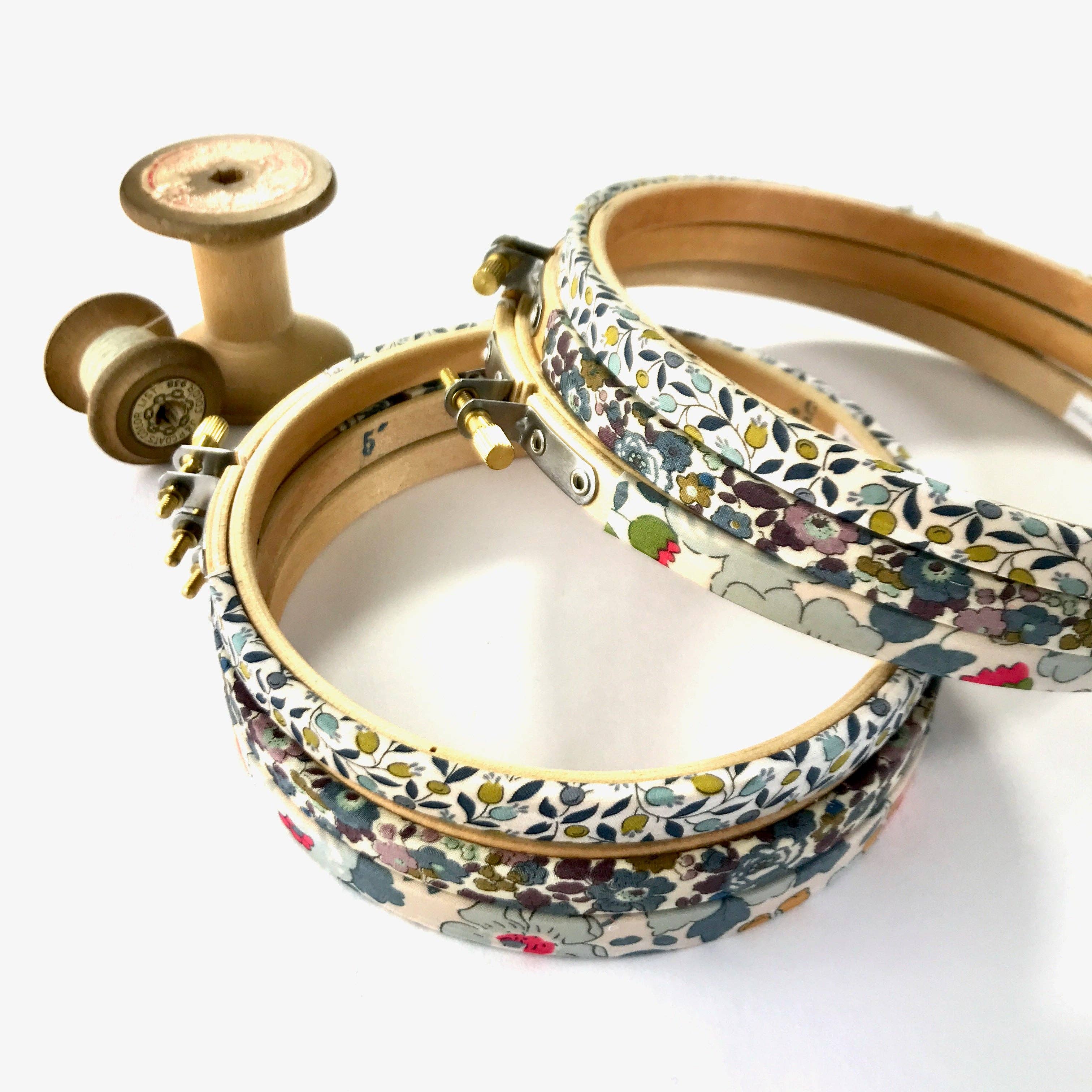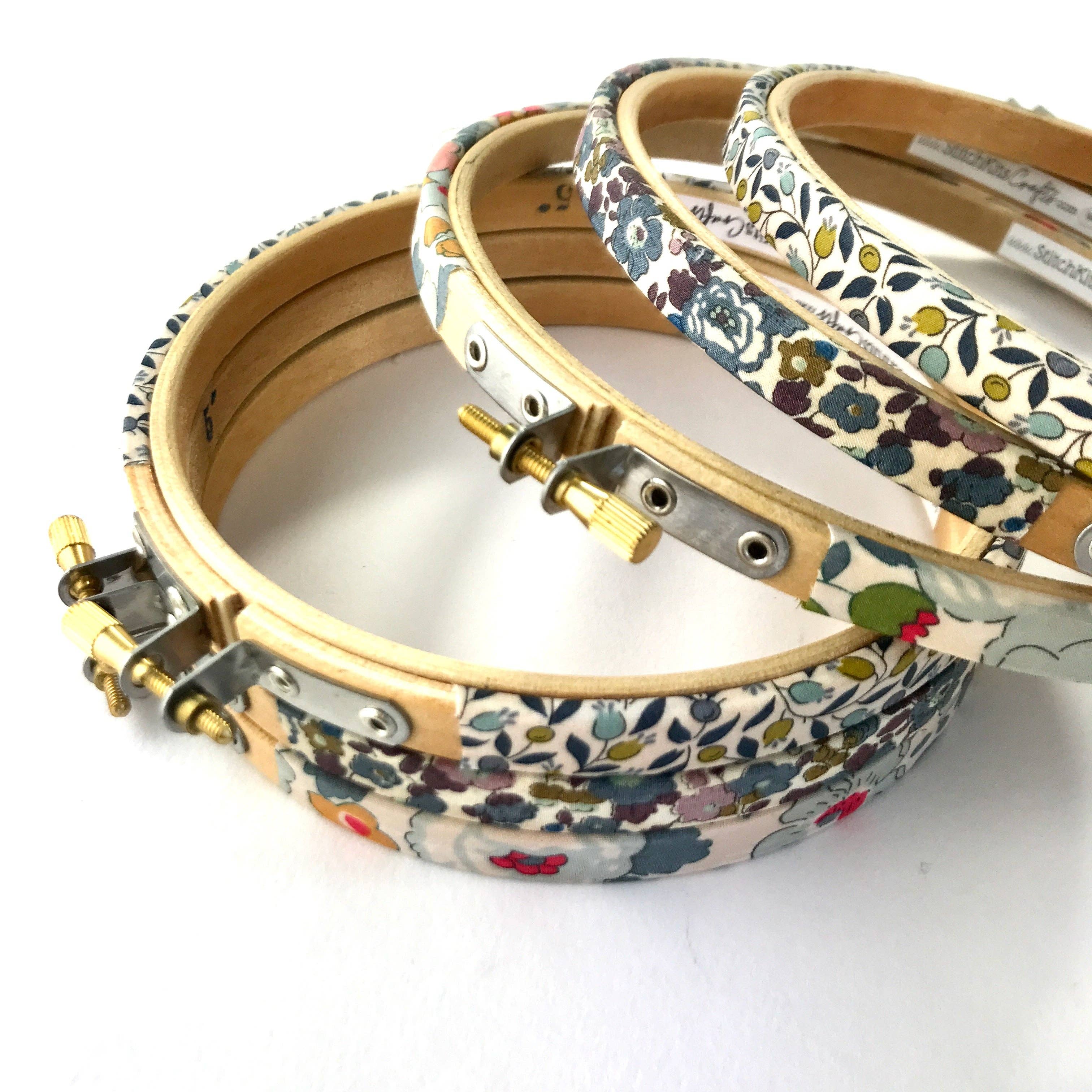 These high quality 6" wooden embroidery hoops from Stitchkits Crafts have been hand-covered in Liberty fabric. These embroidery hoops feature prints in soft neutral colors. The hoops are high quality and durable, so they can be used either as a frame for a textile wall hanging of as a working needle craft hoop. Sold individually. Choose from three different color ways. Spools not included.