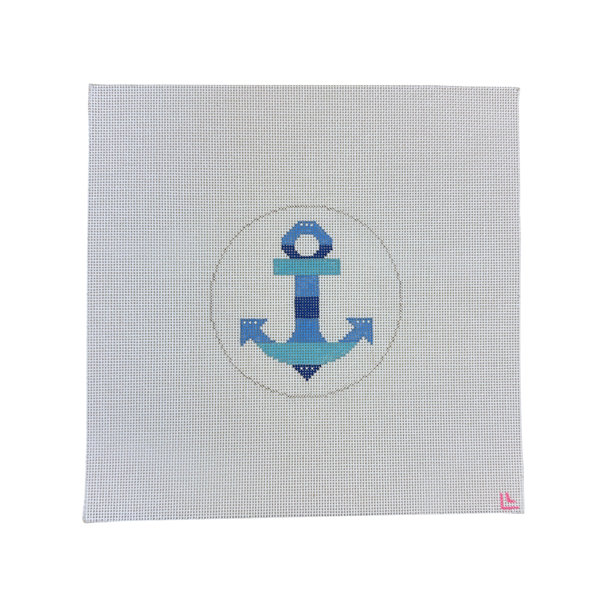 This hand painted needlepoint canvas features a striped anchor in shades of blue.