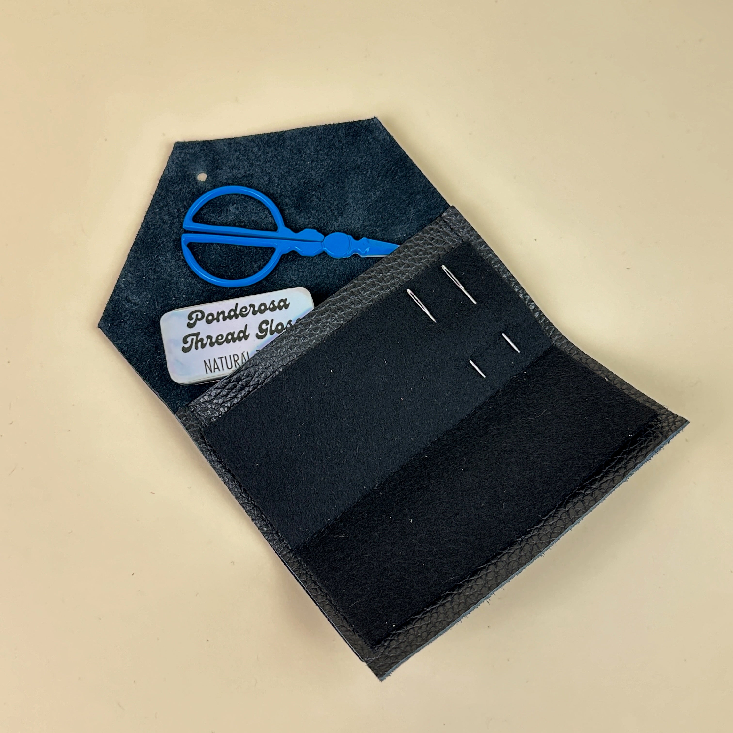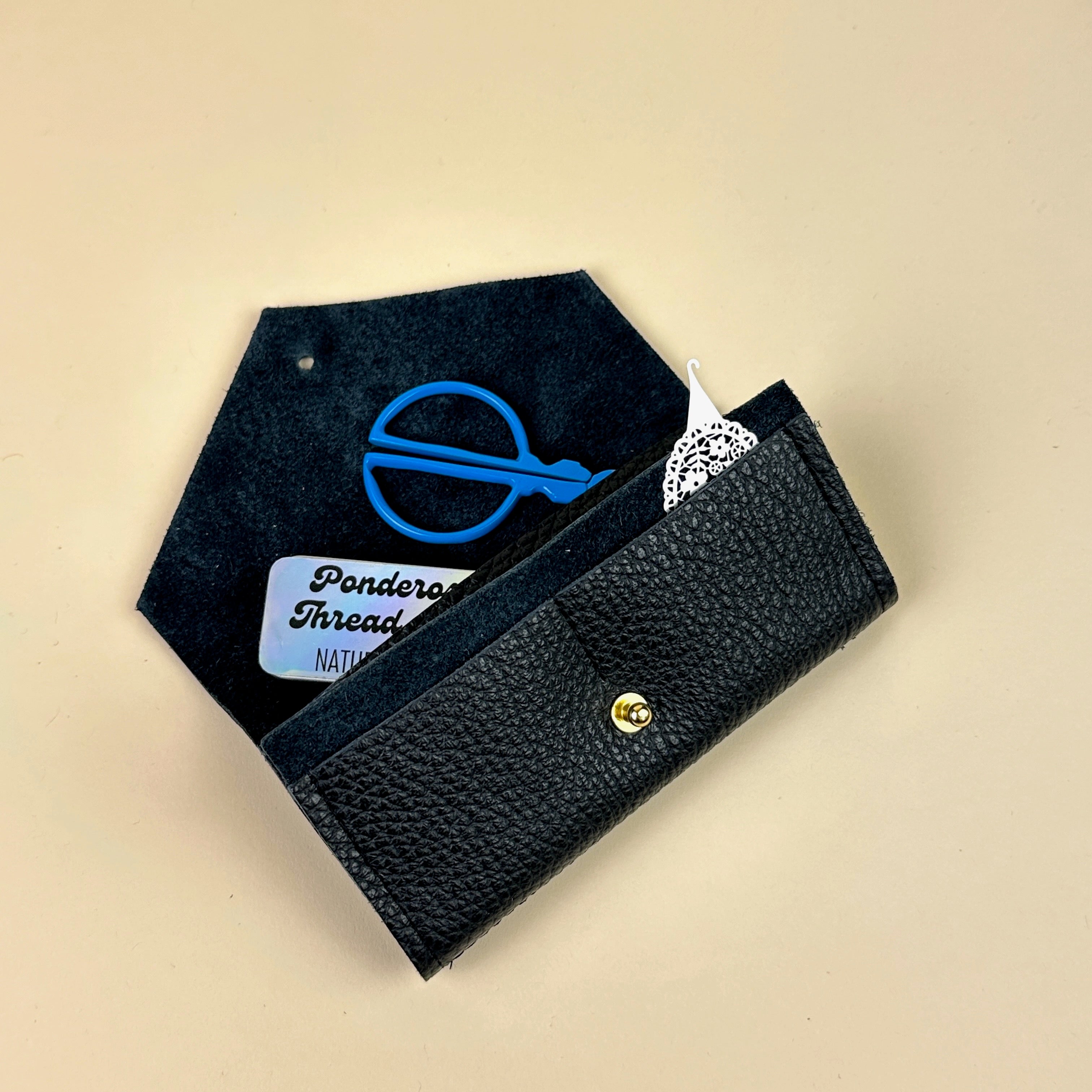 This gorgeous needles and notions case is hand crafted in Cornwall, UK by Studio Lowen (fun fact - Lowen means joy in Cornish!). Made of soft Italian leather in black, it features: felt for your needles, a larger pocket which is perfect for a pair of embroidery scissors, and two smaller pockets that are great for a needle thread, needle tugger, and other petite tools or notions. Needles and tools sold separately.