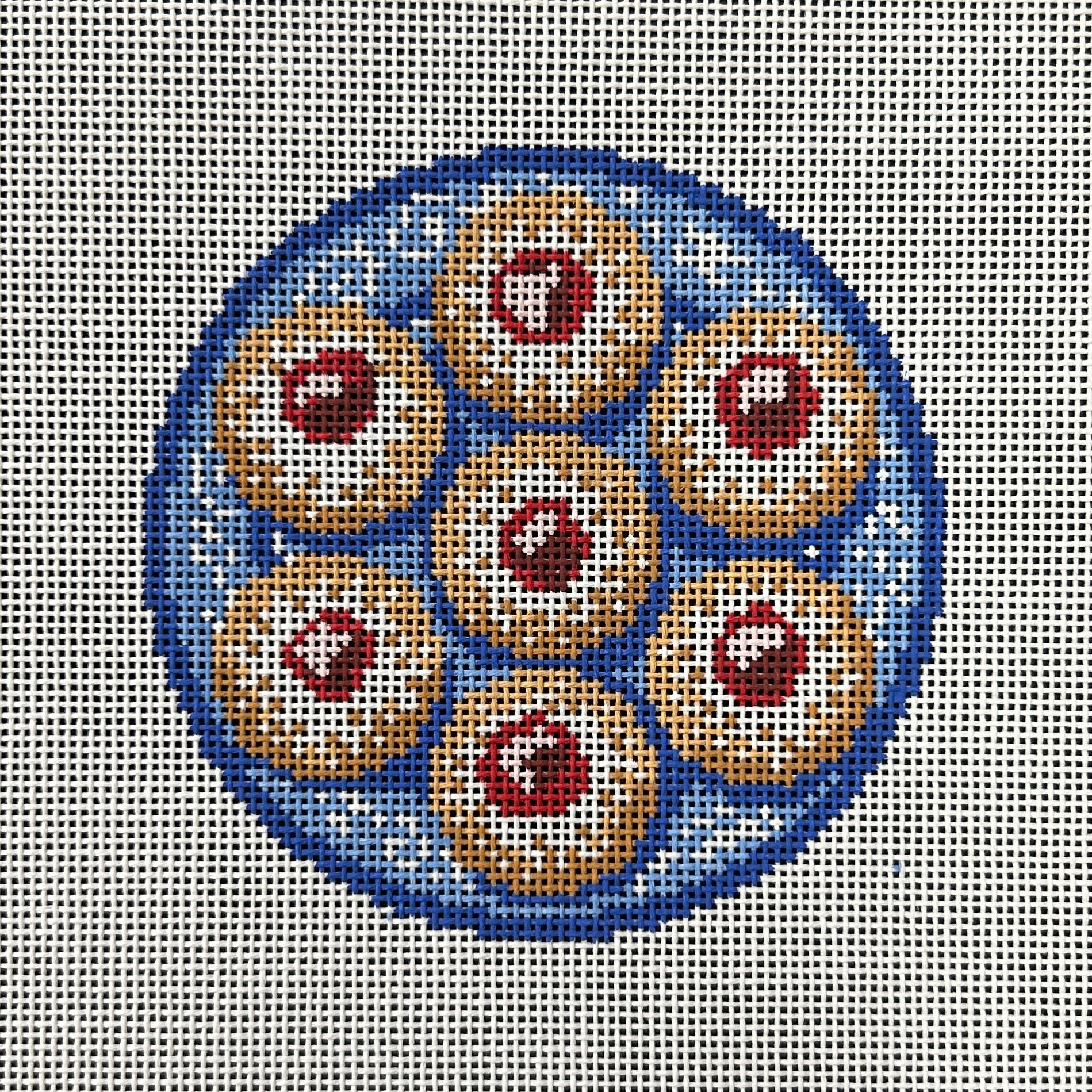 This hand painted needlepoint canvas by Rittenhouse Needlepoint features a platter of the popular Hanukkah sweet treat Sufganiyot jelly donuts.