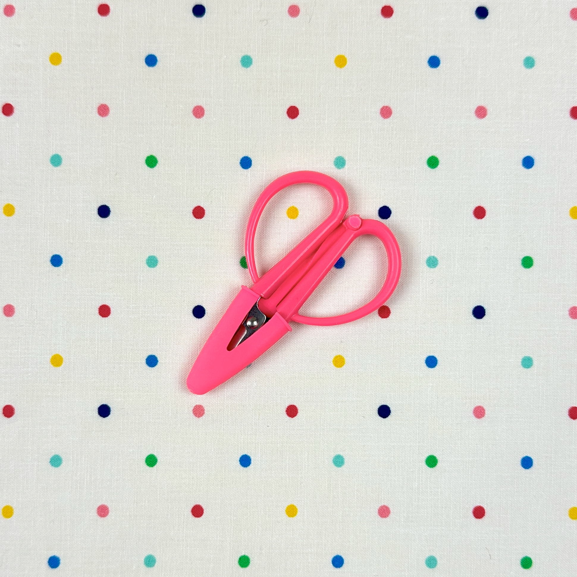 Fun colors and a mini size make these the cutest little scissors! They are surprisingly sharp and have an attached point protector. The larger finger holes make them easy to use despite their petite size. At only 2 1/2" long, they are perfect for travel and stitching on the go. Choose from hot pink, bright green, or sunny yellow.