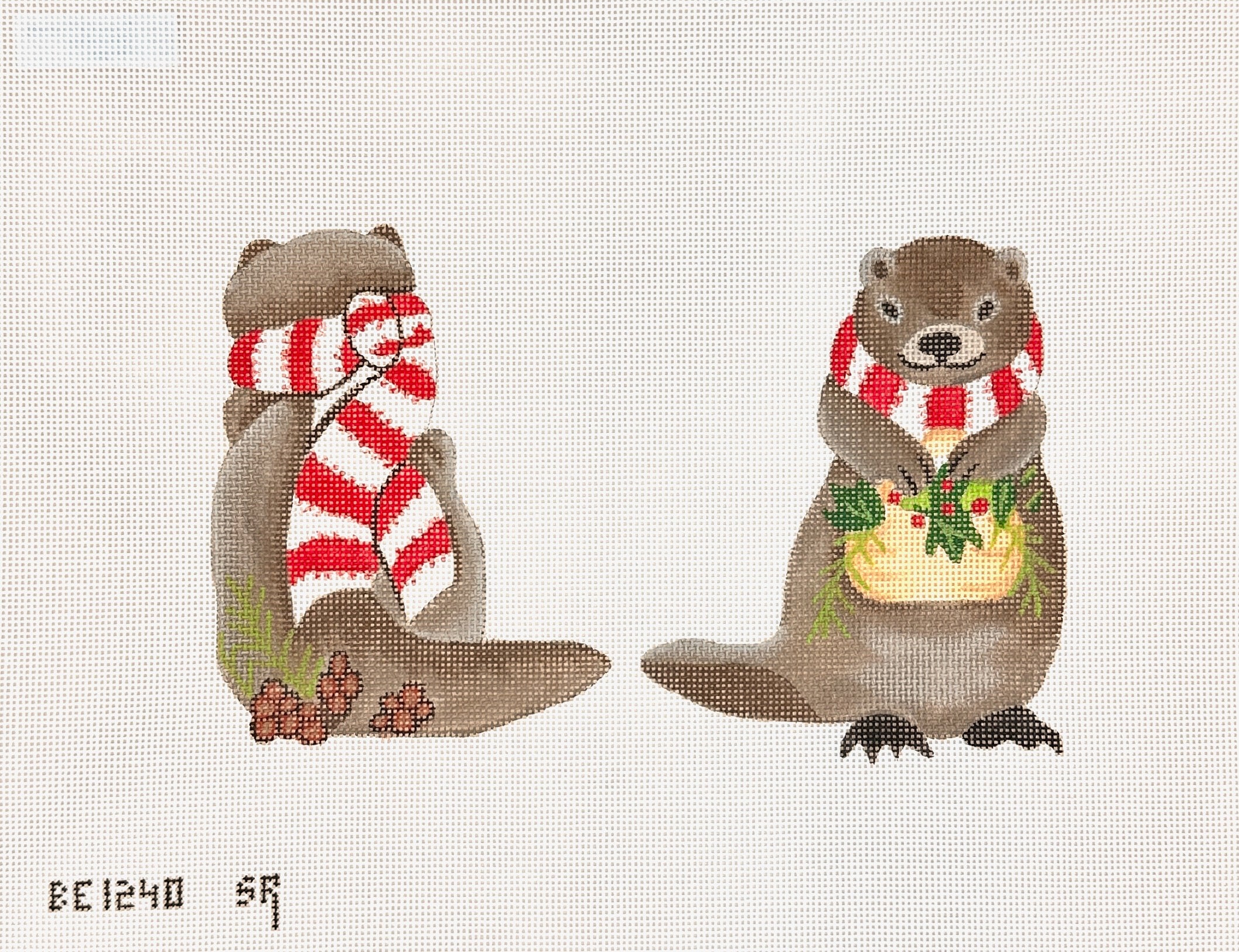 This is a hand painted needlepoint canvas by Barbara Eyre from Susan Roberts Needlepoint. It features a 3D design of an otter wearing a scarf.