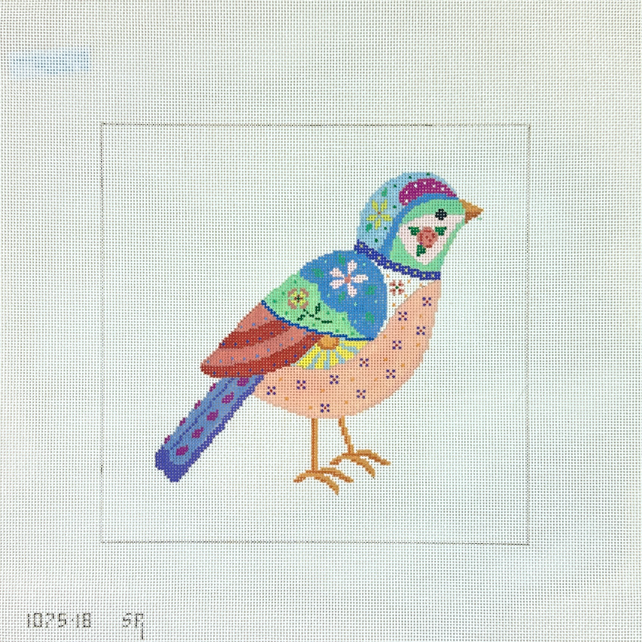 This is a hand painted needlepoint canvas by Susan Roberts Needlepoint. It features a sweet little bird with floral patterns on its feathers.