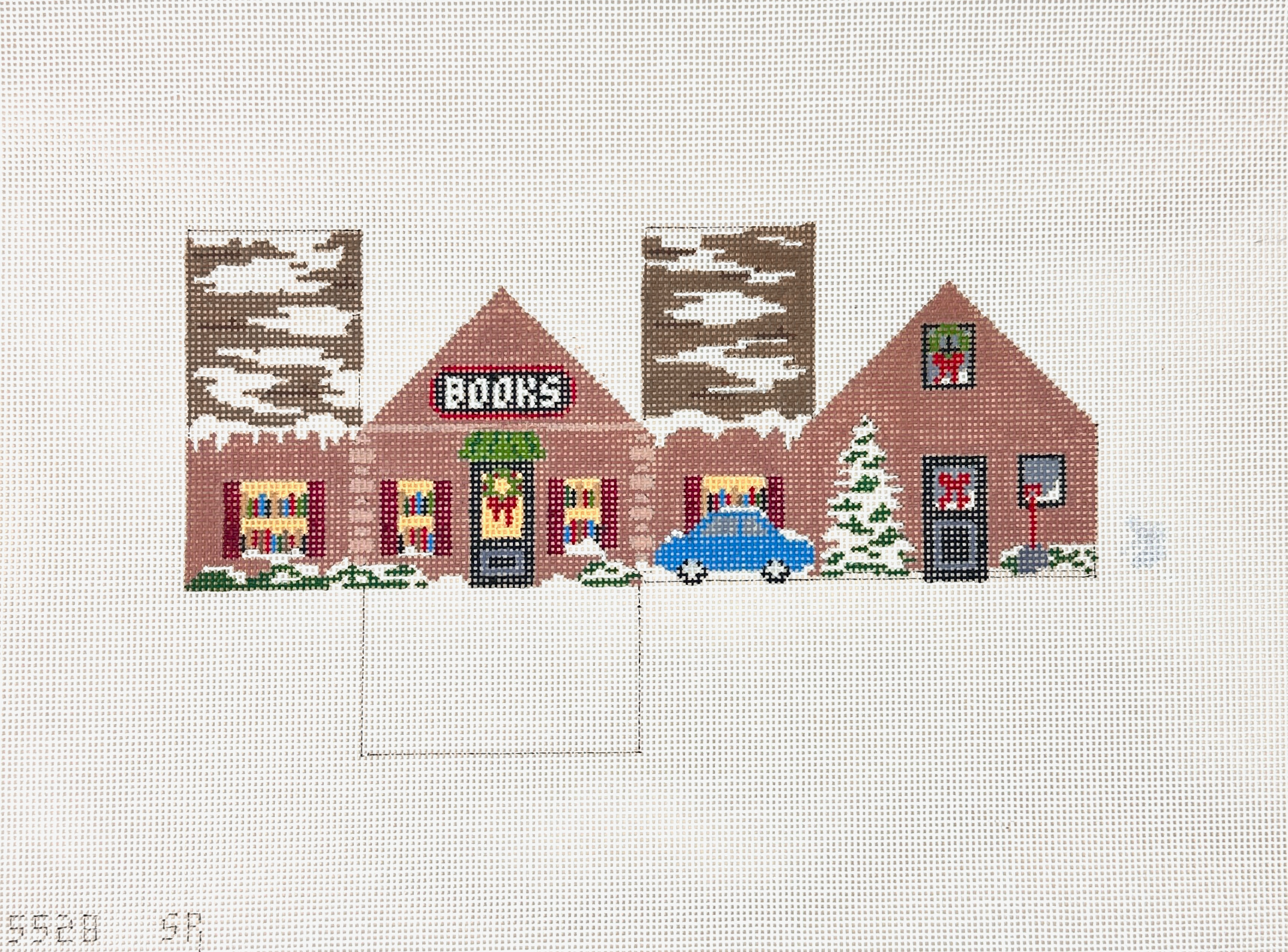 This hand painted needlepoint canvas by Susan Roberts is designed to be finished into a 3D mini house with a book shop theme.