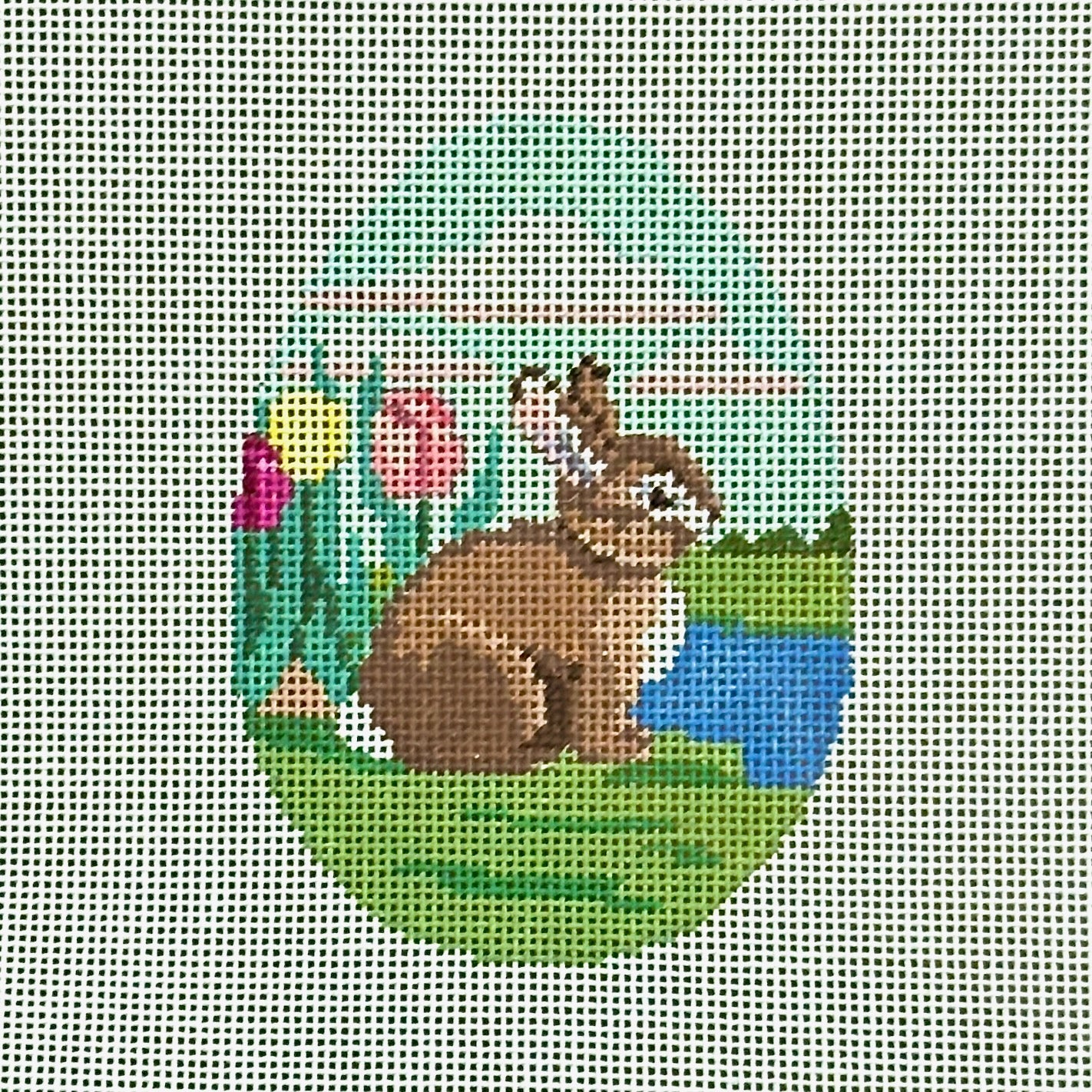 This hand painted egg shaped needlepoint canvas by Susan Roberts features a sweet bunny rabbit amongst tulips.
