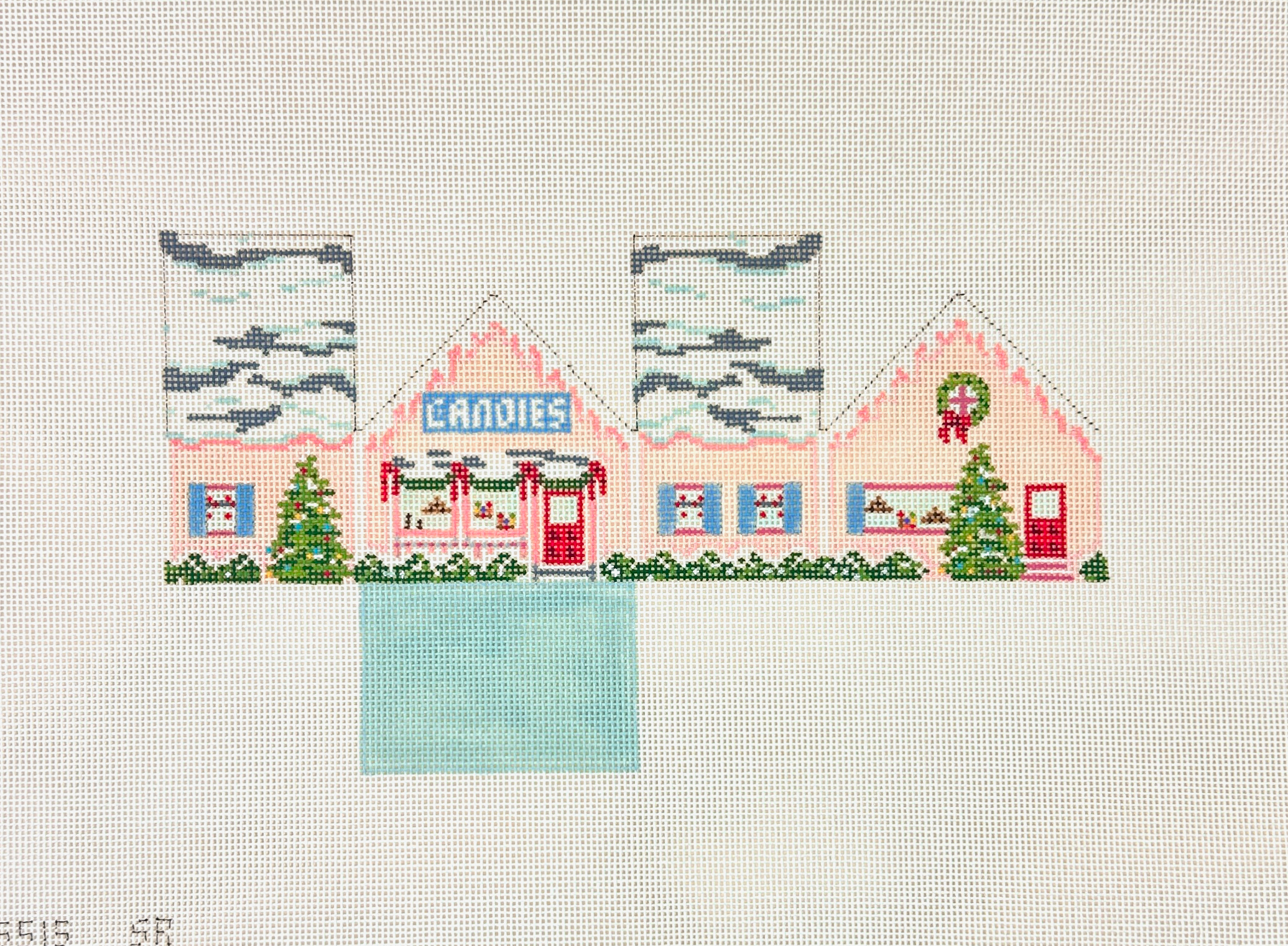 This hand painted needlepoint canvas by Susan Roberts is designed to be finished into a 3D mini house with a candy shop theme.