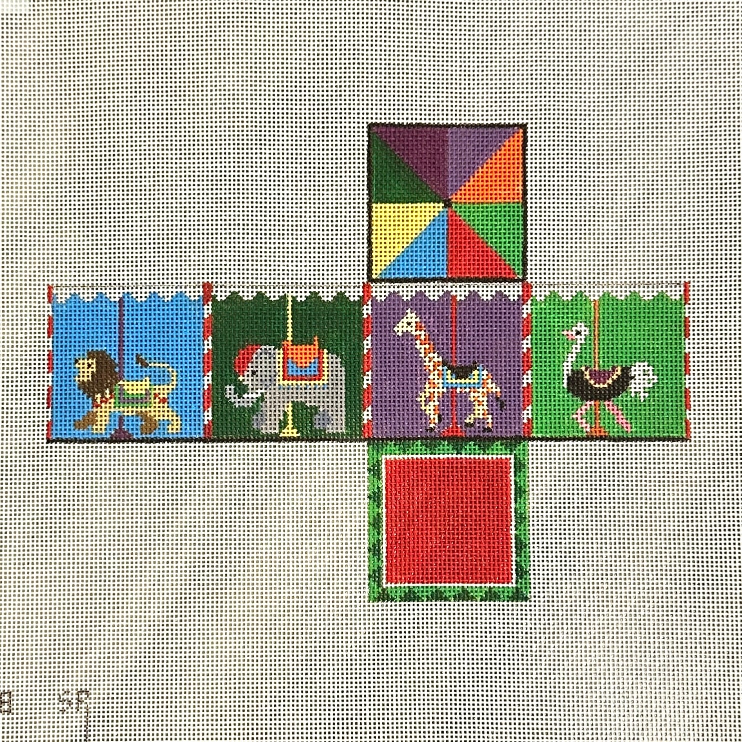 This hand painted 3D needlepoint canvas from Susan Roberts Needlepoint features a cube ornament with colorful carousel animals.