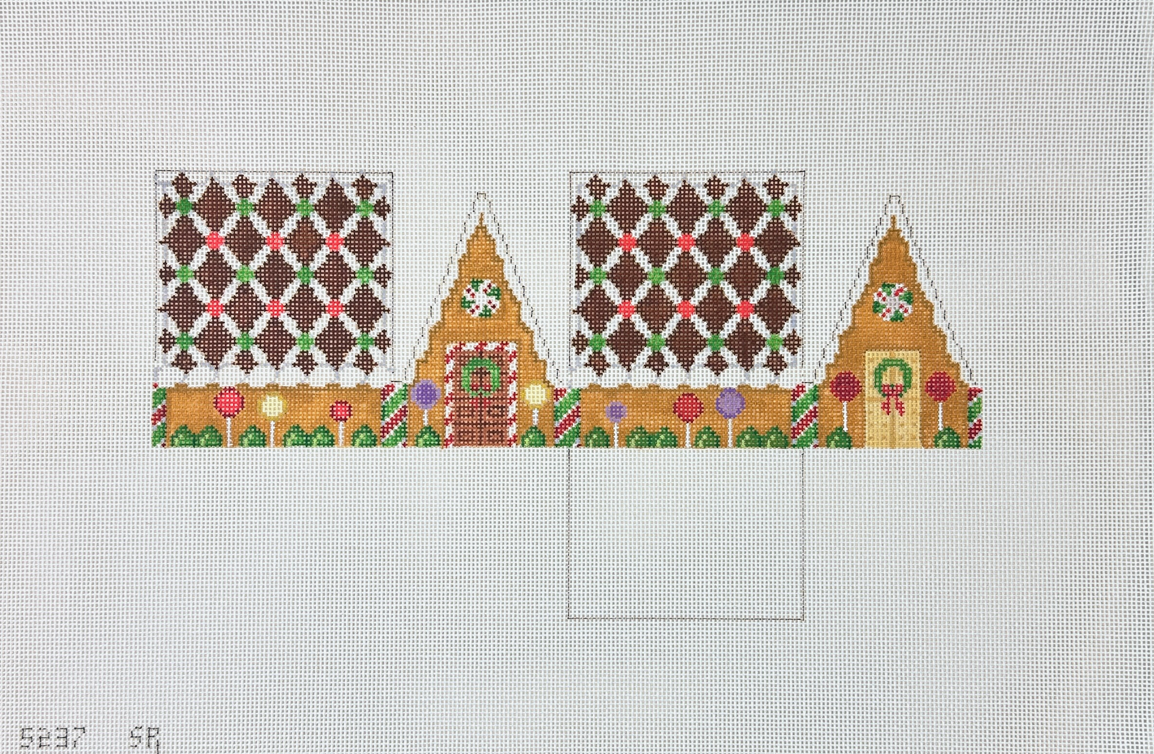 Susan Roberts Needlepoint Chocolate Trellis A-Frame Mini Gingerbread House Needlepoint Canvas is a hand painted needlepoint canvas from Susan Roberts Needlepoint.