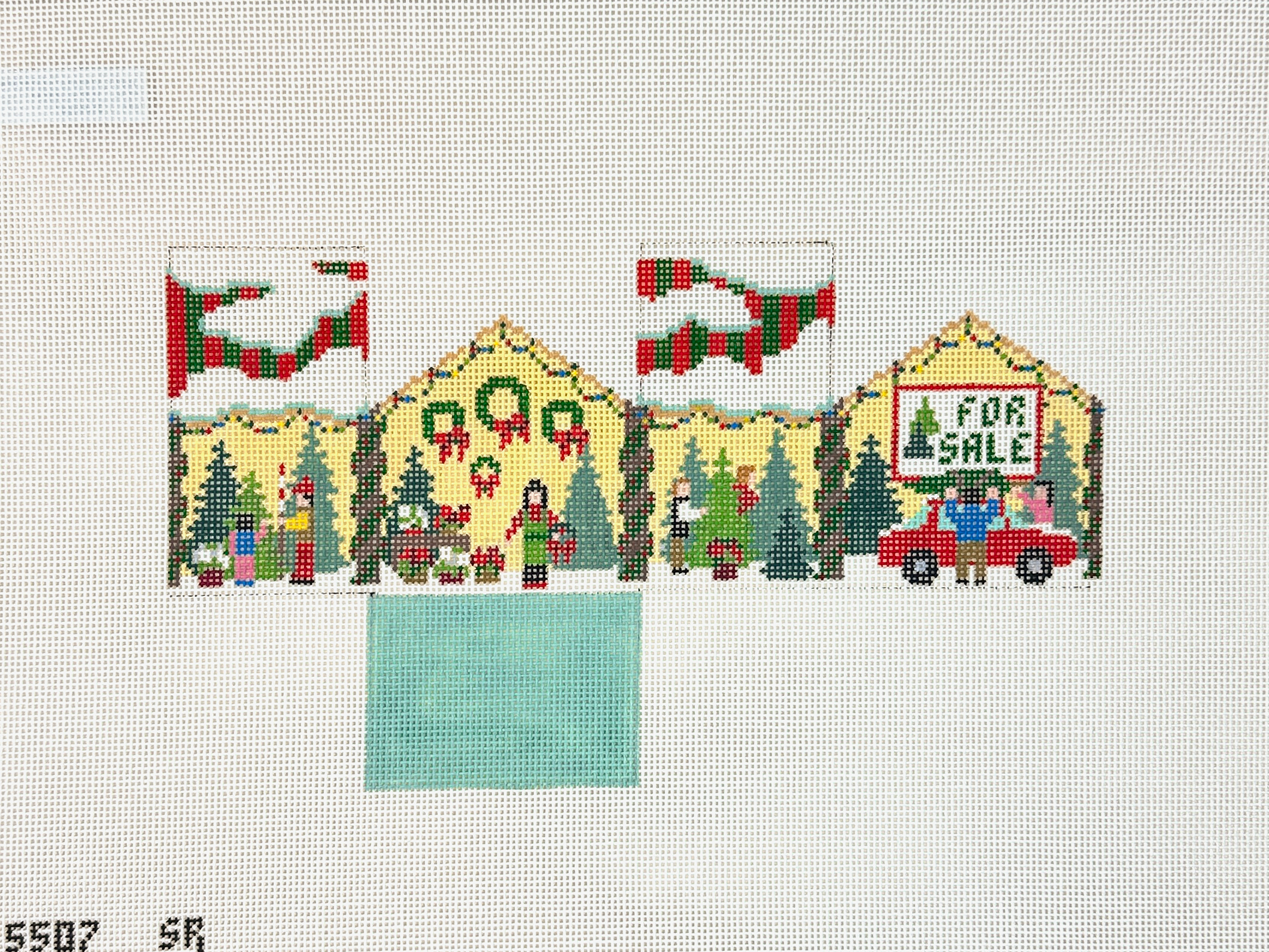 Susan Roberts Needlepoint Christmas Tree Lot Mini House Needlepoint Canvas is a hand painted needlepoint canvas from Susan Roberts Needlepoint.