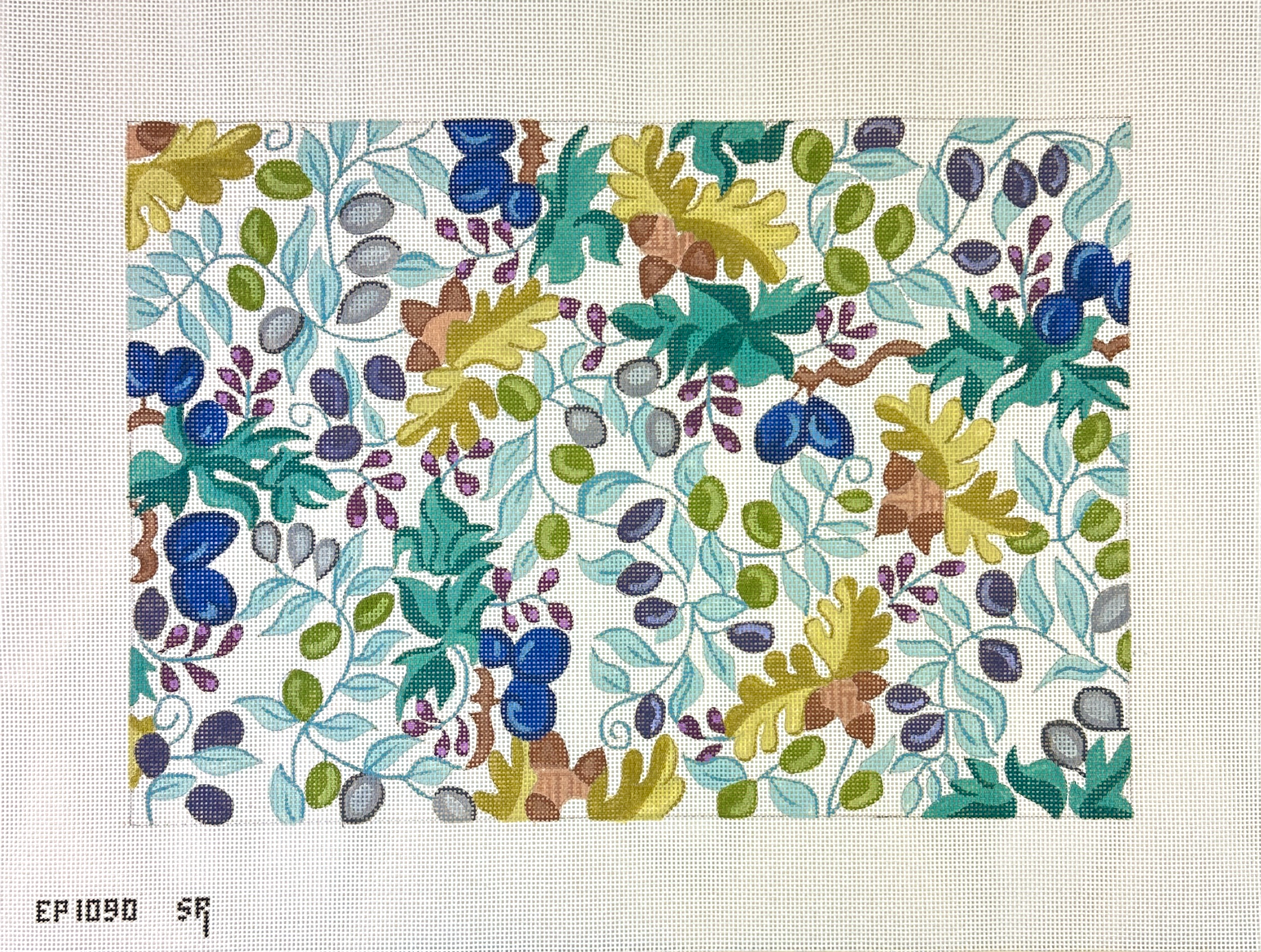 This hand painted needlepoint canvas by Elain Pollack for Susan Roberts Needlepoint features a beautiful botanical design with leaves and sprigs.