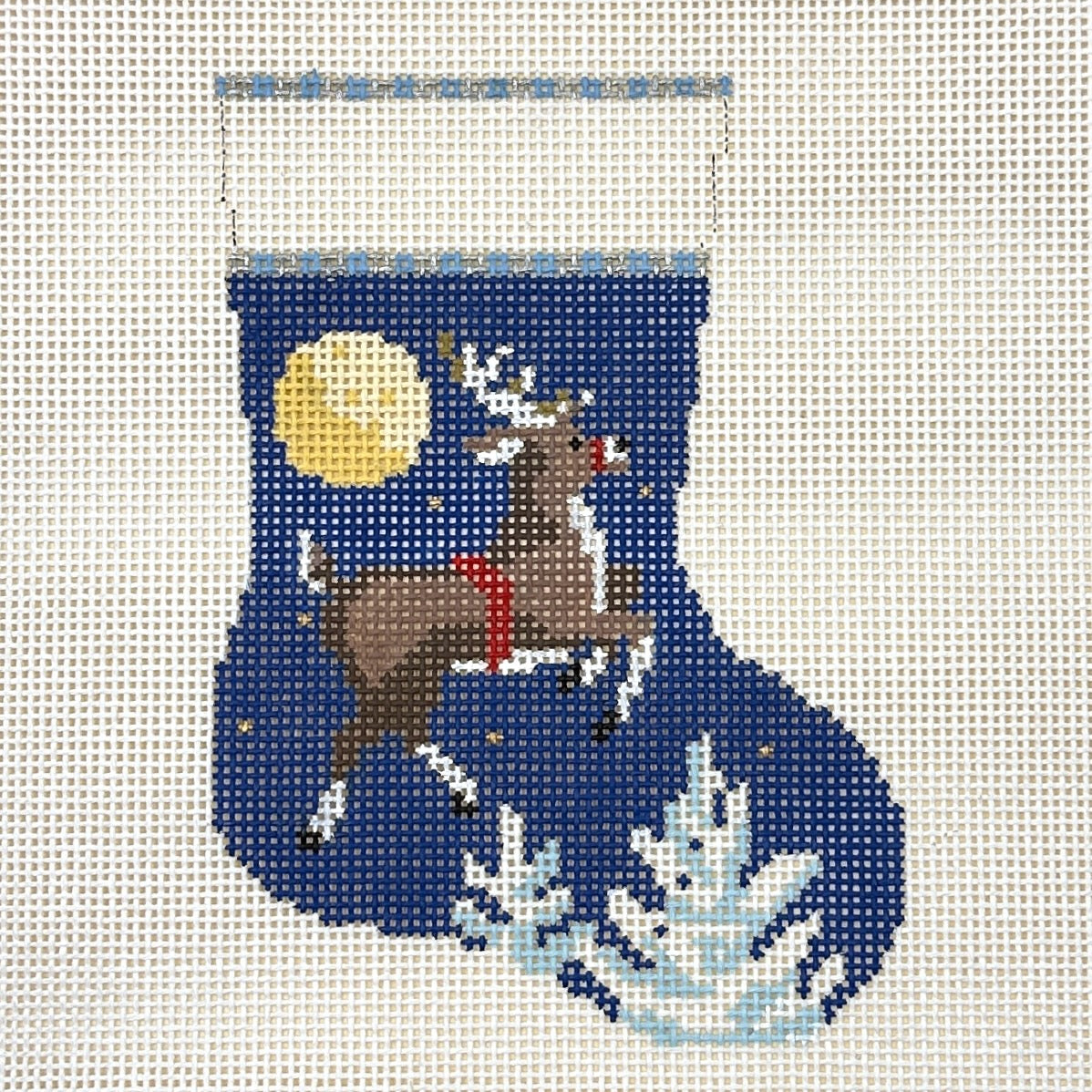This is a hand painted hand painted mini stocking needlepoint canvas from Susan Roberts Needlepoint featuring a reindeer flying across a night sky.