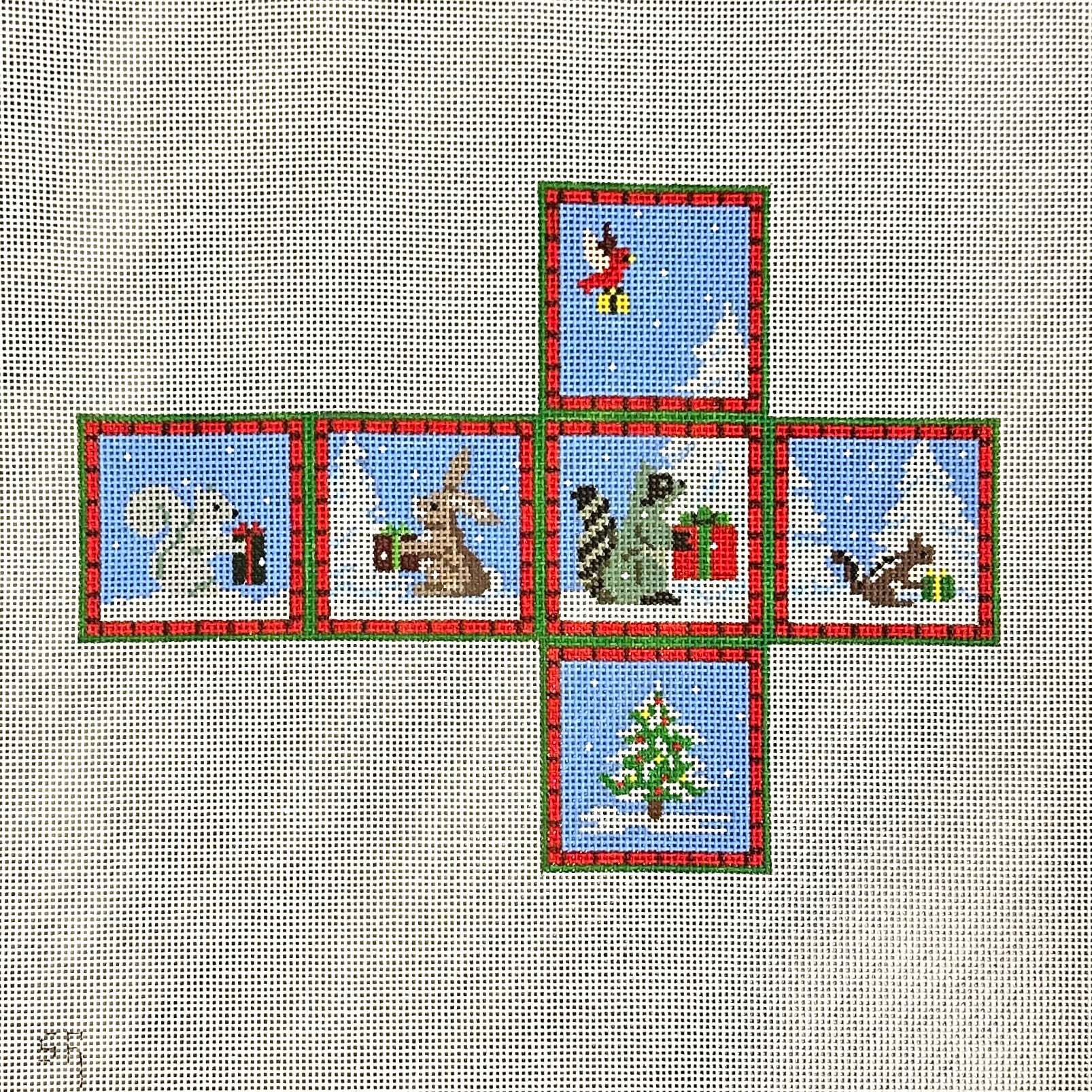This hand painted 3D needlepoint canvas from Susan Roberts Needlepoint features a cube ornament with forest animals giving gifts.