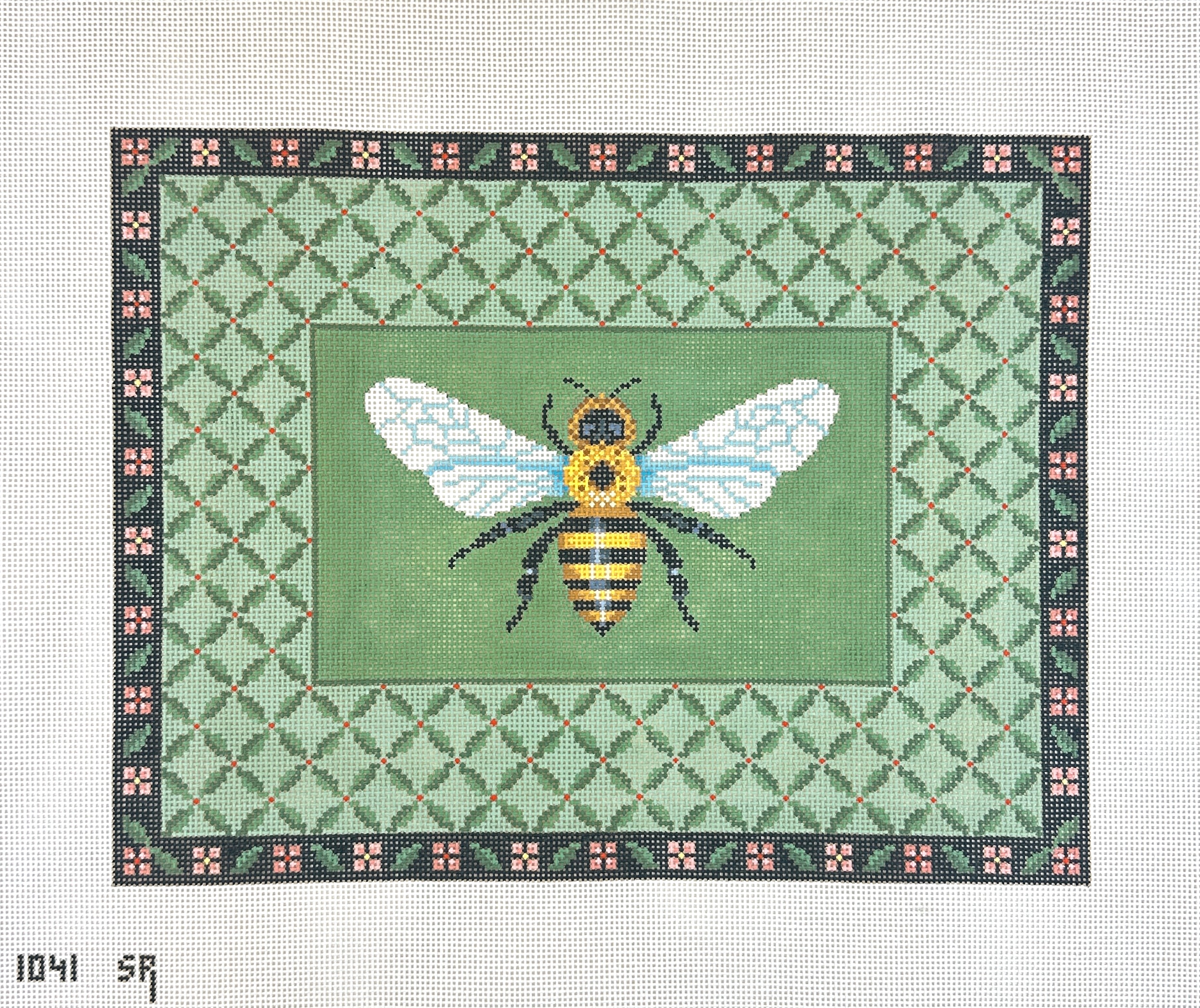 This is a hand painted needlepoint canvas from Susan Roberts Needlepoint featuring a bee over a leafy trellis with floral border.
