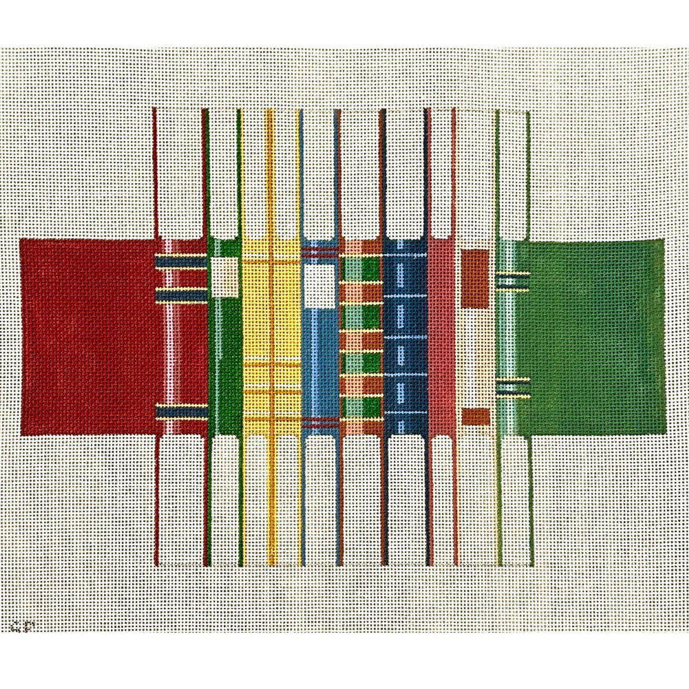 This hand painted brick needlepoint canvas from Susan Roberts Needlepoint features a row of books.