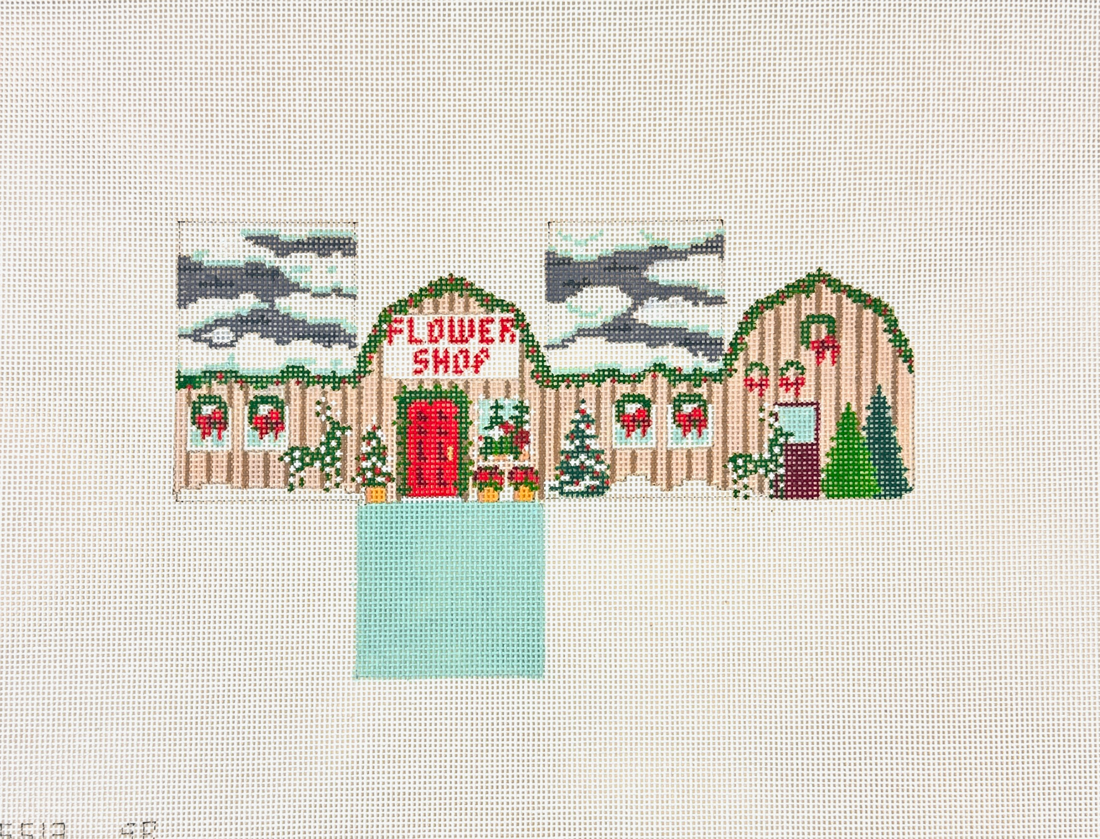 This hand painted 3D needlepoint canvas from Susan Roberts Needlepoint features mini flower shop ready for Christmas.