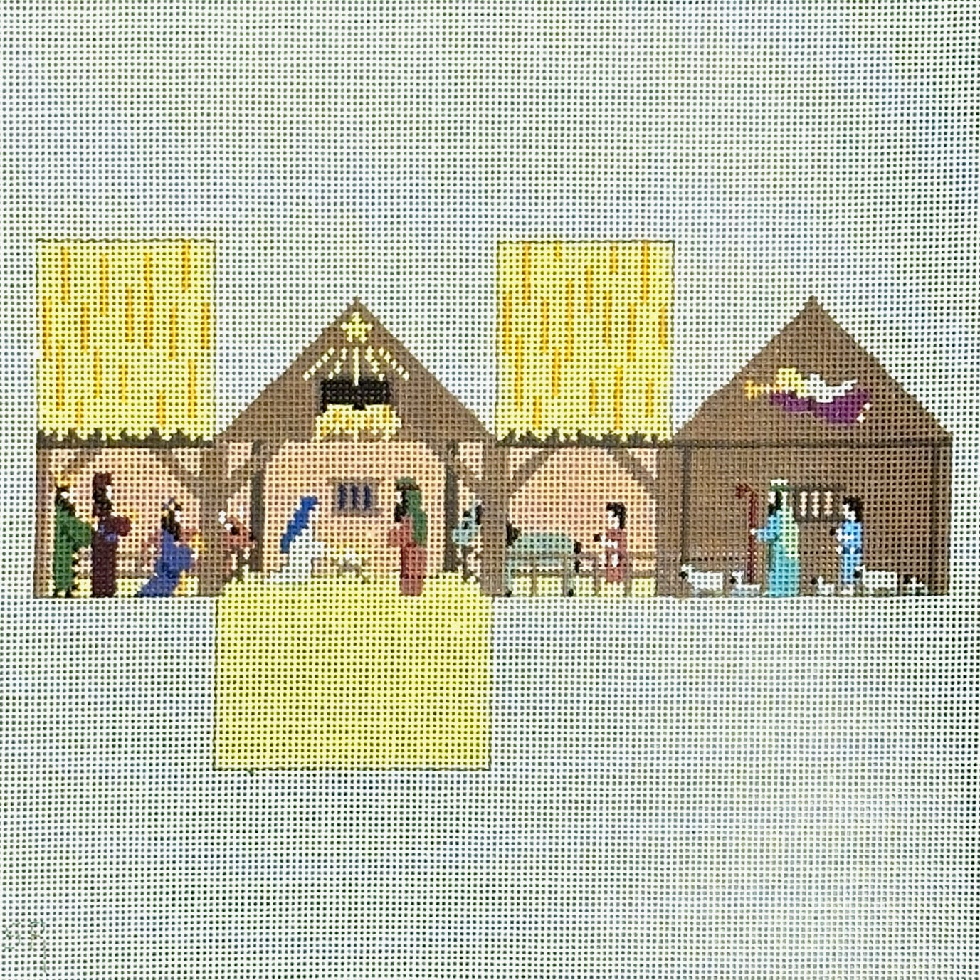 This hand painted needlepoint canvas by Susan Roberts is designed to be finished into a 3D mini house depicting a nativity scene.