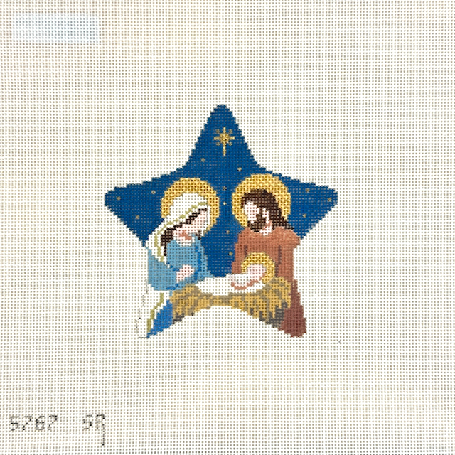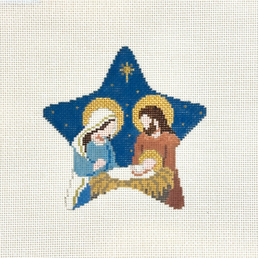 This is a hand painted needlepoint canvas by Susan Roberts Needlepoint. It features a star with a close-up of a scene from The Nativity.