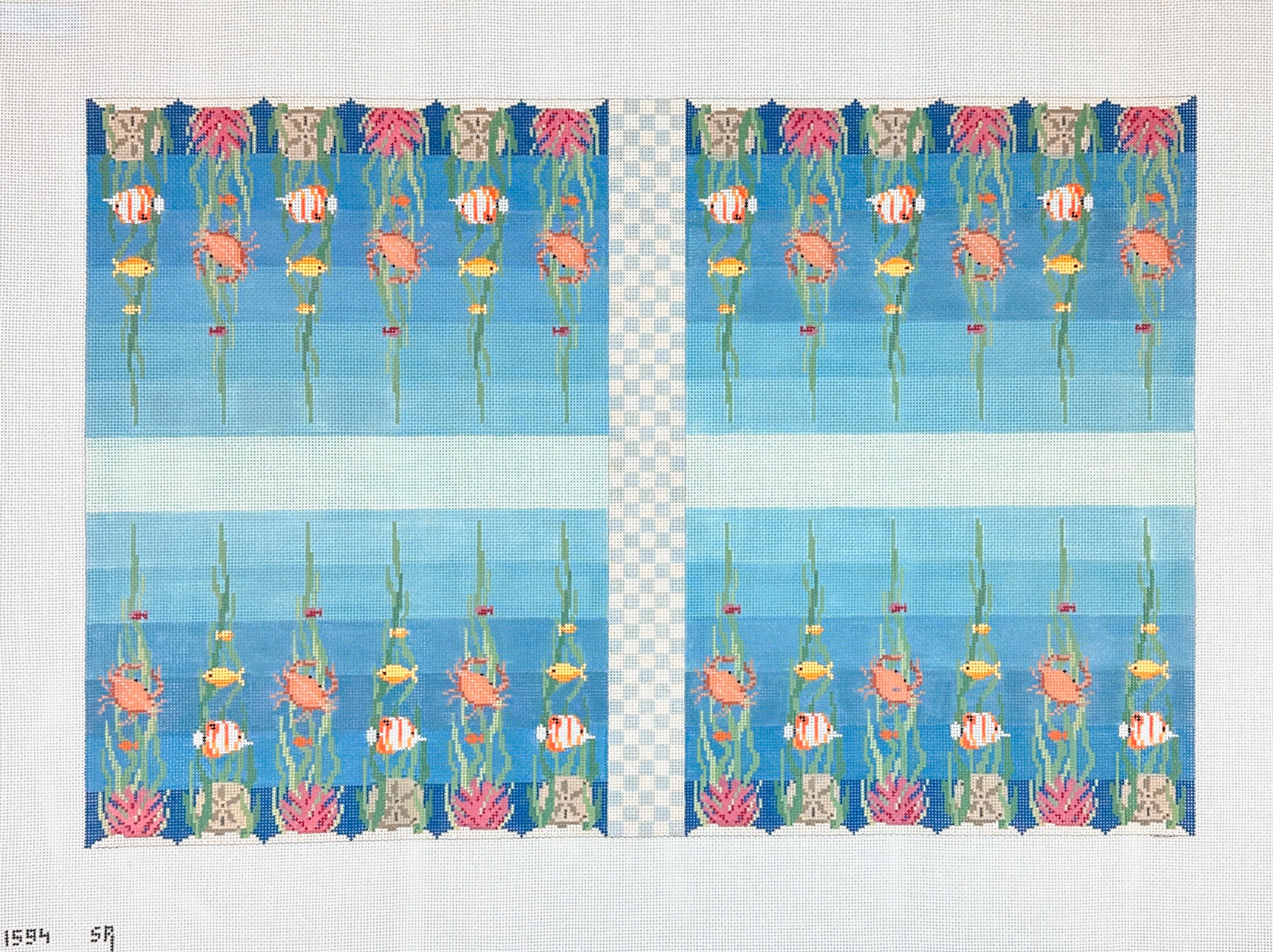 This is a hand painted needlepoint canvas from Susan Roberts Needlepoint featuring a backgammon board design with colorful tropical fish.