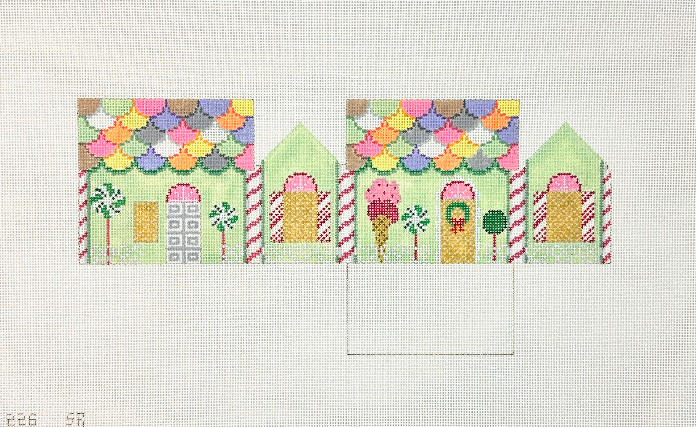 This hand painted needlepoint canvas by Susan Roberts is designed to be finished into a 3D gingerbread house with a dessert theme.