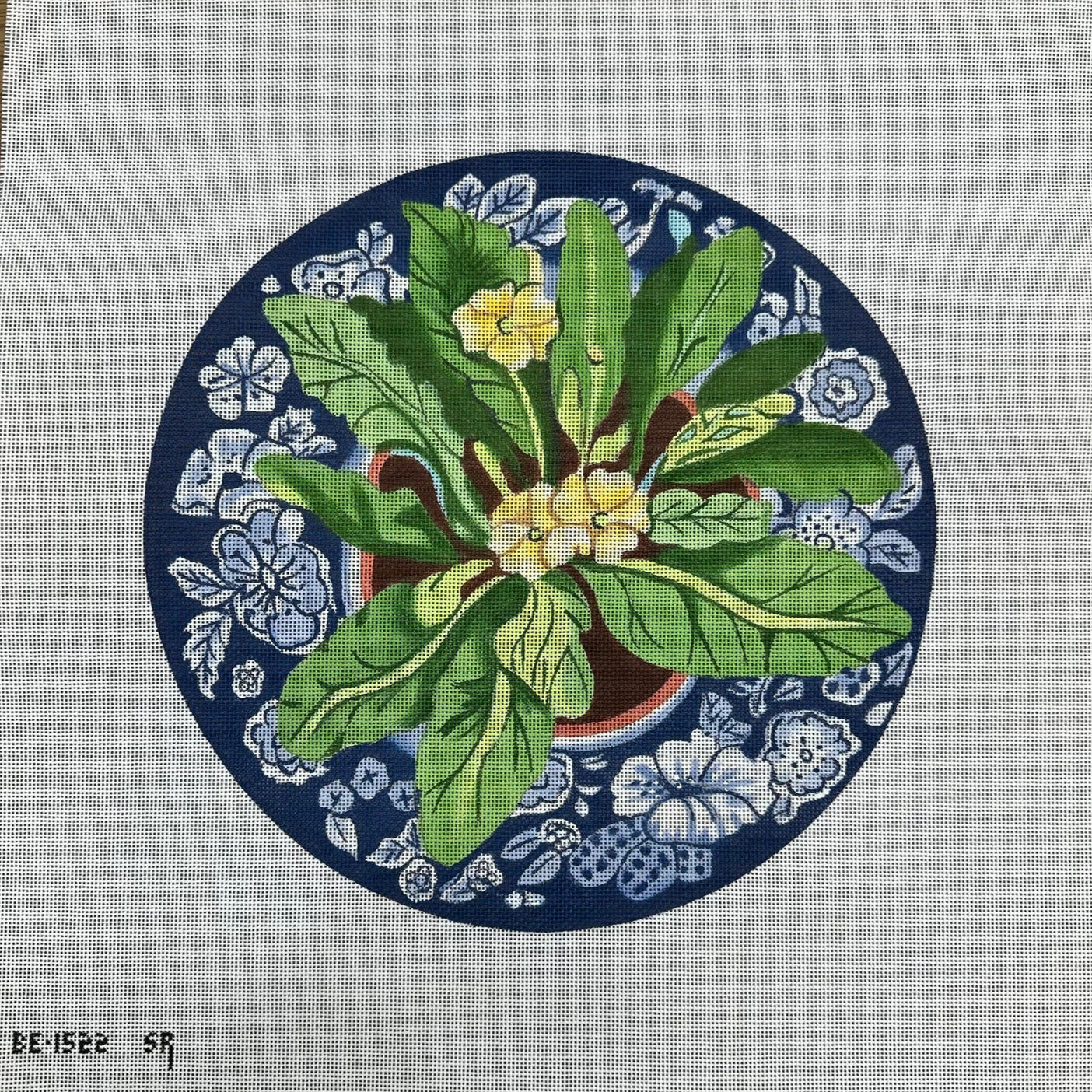 This is a hand painted needlepoint canvas by Barbara Eyre from Susan Roberts Needlepoint. It features a primrose plate design.