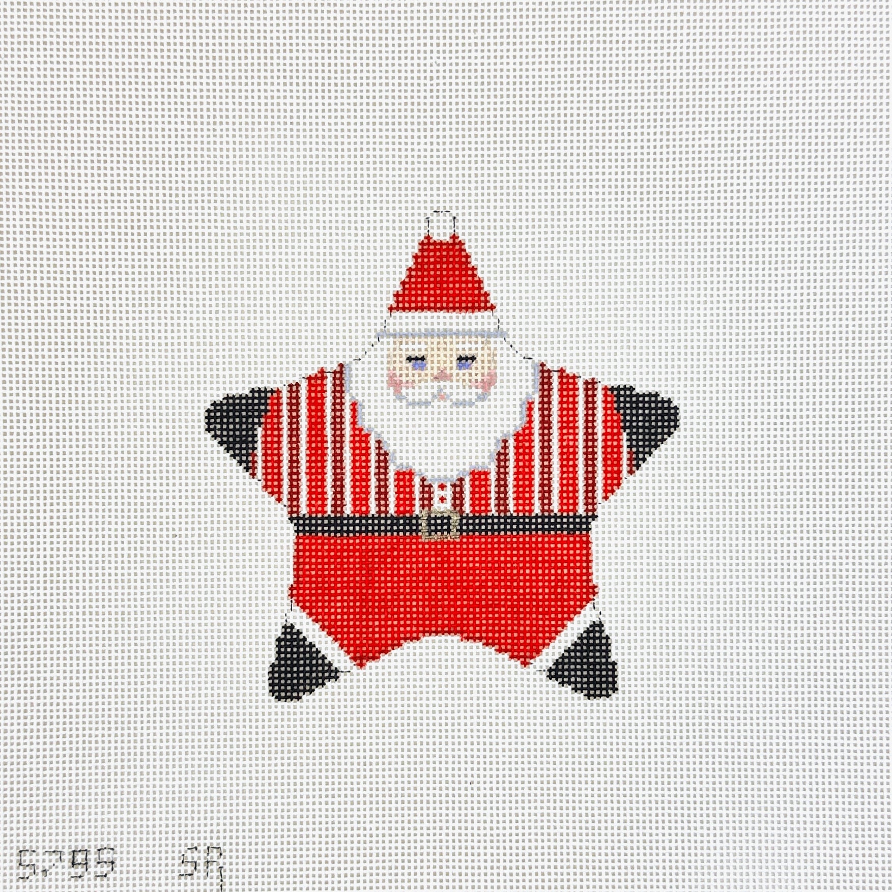 This is a hand painted needlepoint canvas by Susan Roberts Needlepoint featuring star shaped Santa with stripes.