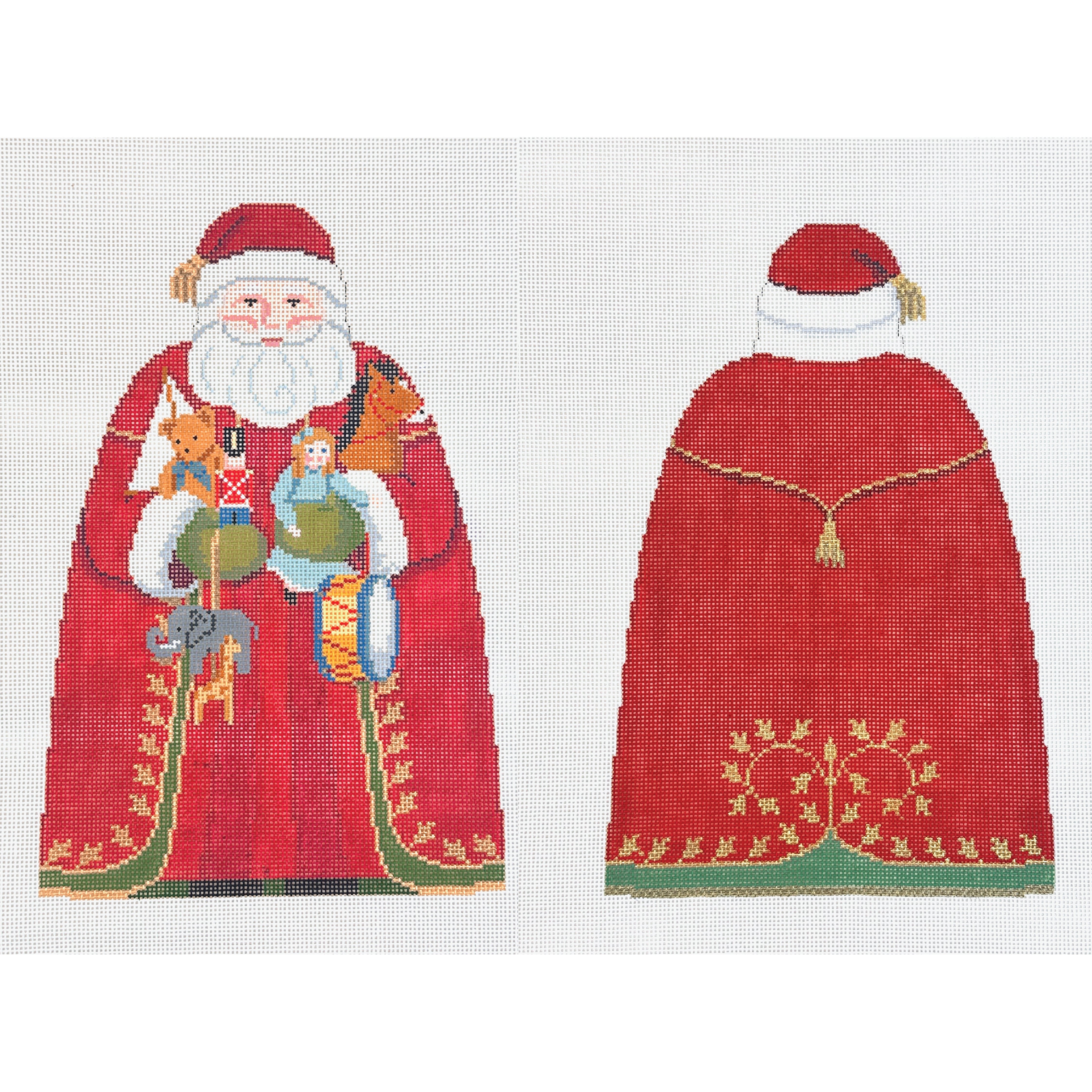 This is a set of hand painted needlepoint canvases from Susan Roberts Needlepoint. Included are the front and back of a Santa with and armful of toys designed to be finished as a two sided tree topper or stand up.