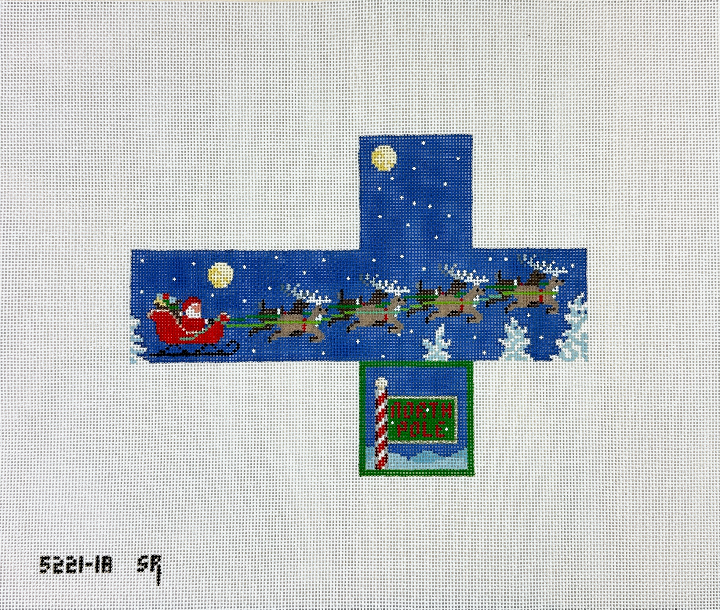This hand painted needlepoint canvas by Susan Roberts Needlepoint is designed to be finished into a 3D cube with Santa's sleigh flying across it.