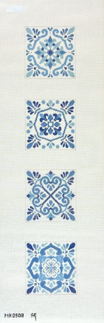 This is a hand painted needlepoint canvas by Susan Roberts Needlepoint. It features a line of four blue and white floral coasters, each with a different pattern.