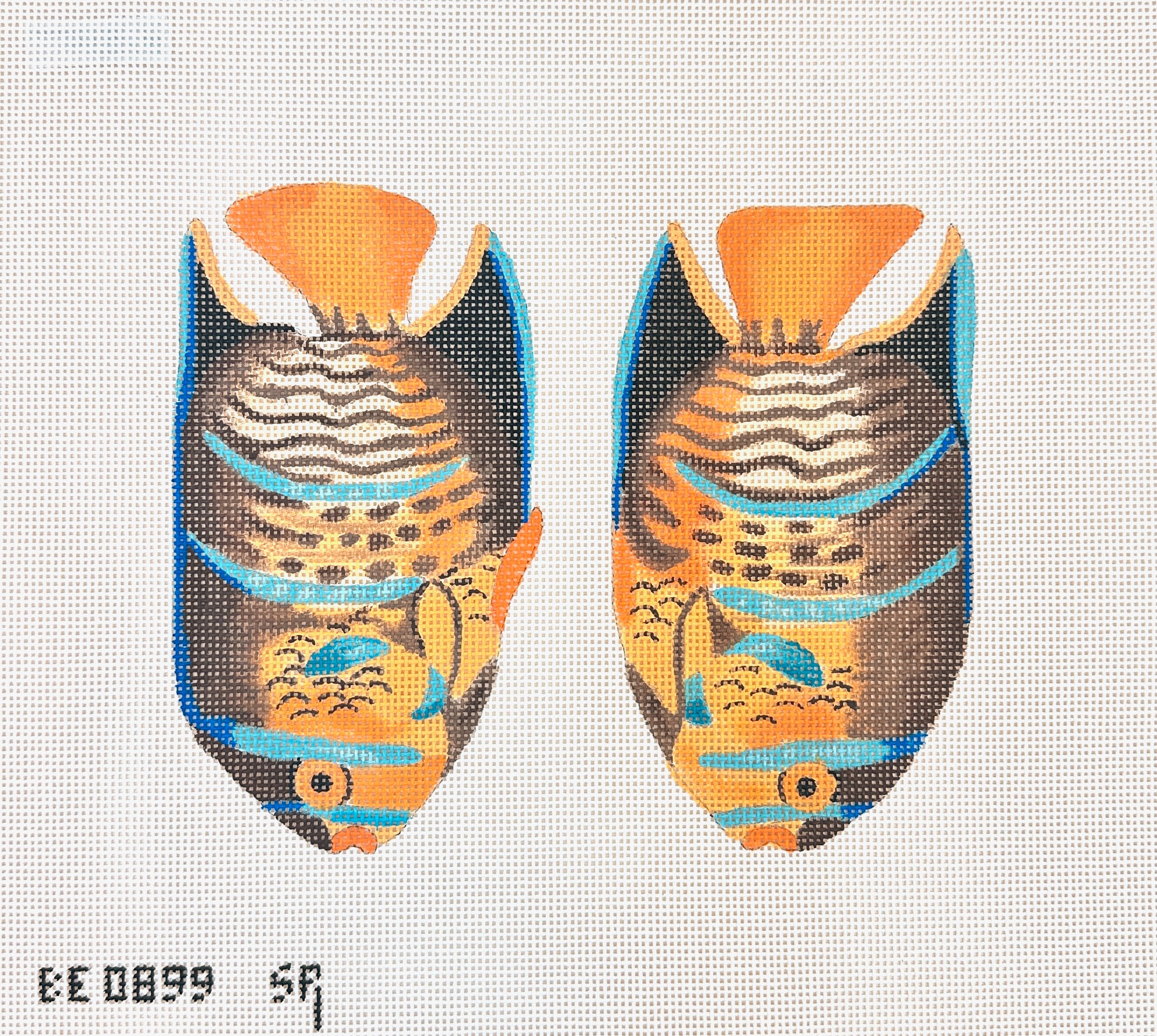 This is a hand painted needlepoint canvas from Susan Roberts Needlepoint featuring two-sided yellow and blue tropical fish.