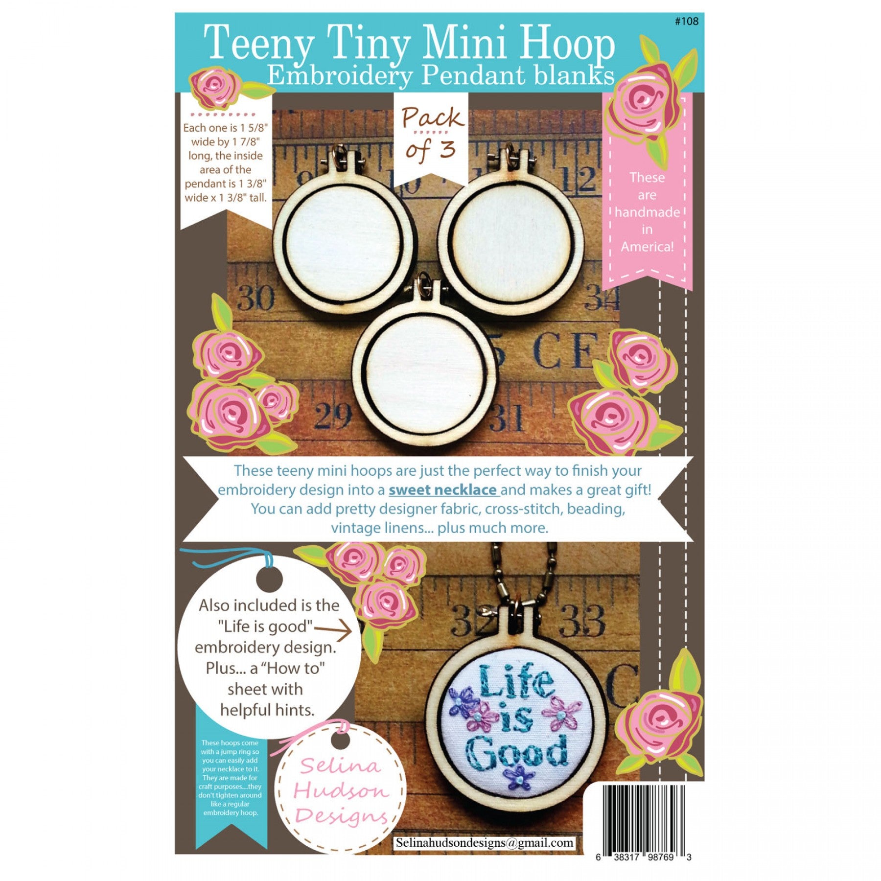 These Teeny Round mini hoops are a great way to create pendants from your needlework! You can create little masterpieces in cross stitch, embroidery, or needlepoint then wrap them around the base disc and put the frame over it. It is recommended to use a piece of felt and some adhesive to cover the back and secure everything in place. For needlepoint, 13M is a snug fit and may require a bit of sanding to fit well, but 18M fits without sanding. Hang your pendant on a chain or ribbon and you have lovely piece to wear or gift. Note that there may be some darkening on the back of the frame from the laser cutting process.