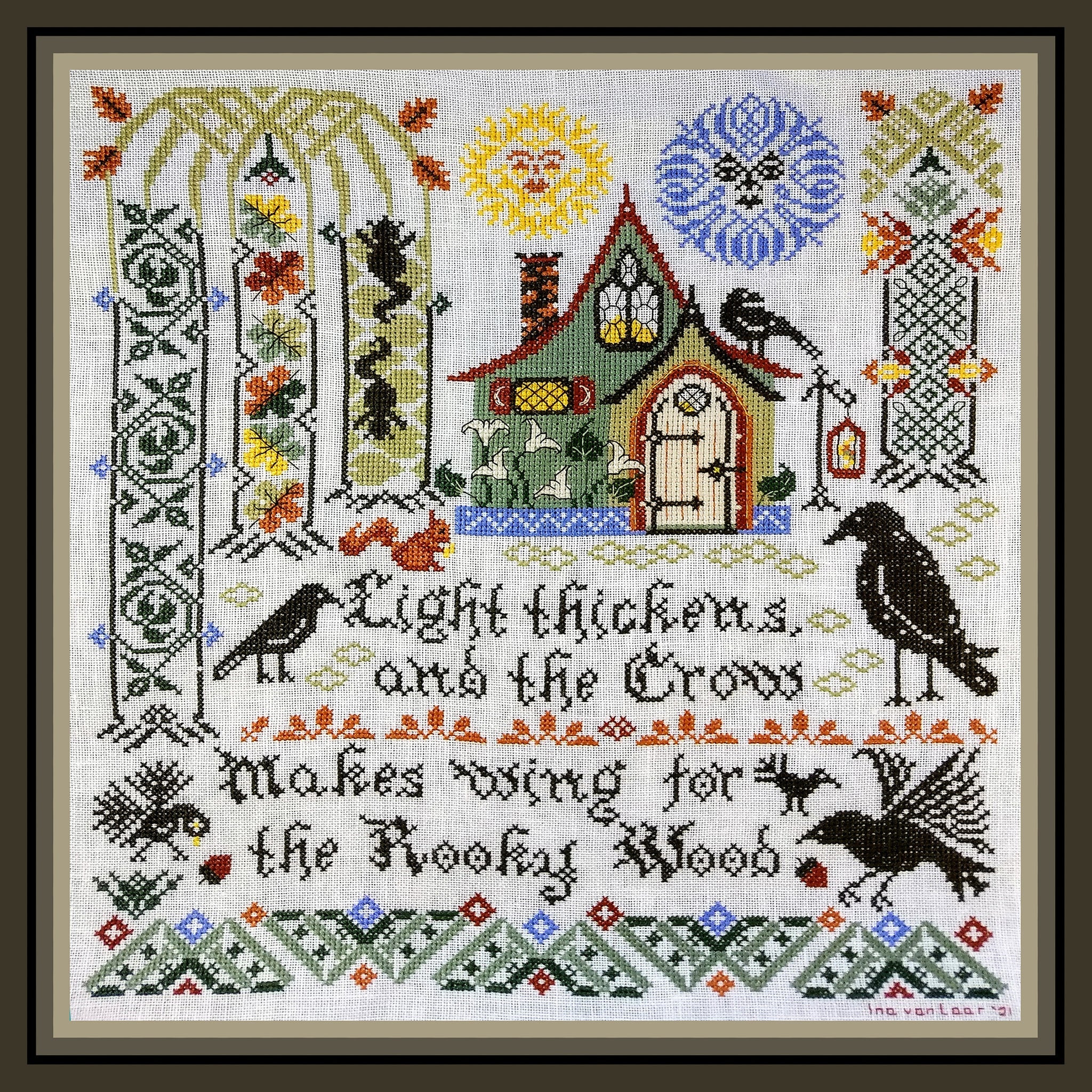 This is a cross stitch pattern design by Tempting Tangles Designs. It features a vivid design inspired by Shakespeare's Macbeth, with crows and an old house in view.