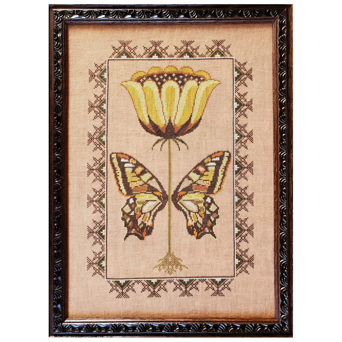 This is a printed cross stitch pattern by The Artsy Housewife. It features a cheerful yellow blossom behind a detailed yellow butterfly, surrounded by a quaint geometric pattern. As stitched, this pattern uses Classic Colorworks and The Gentle Art Sampler Threads cotton flosses on 40 ct linen in the color "Mocha" by Weeks Dye Works.