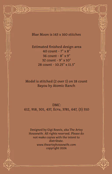 This is a printed cross stitch pattern from The Artsy Housewife featuring a spotted bird under a blue moon.