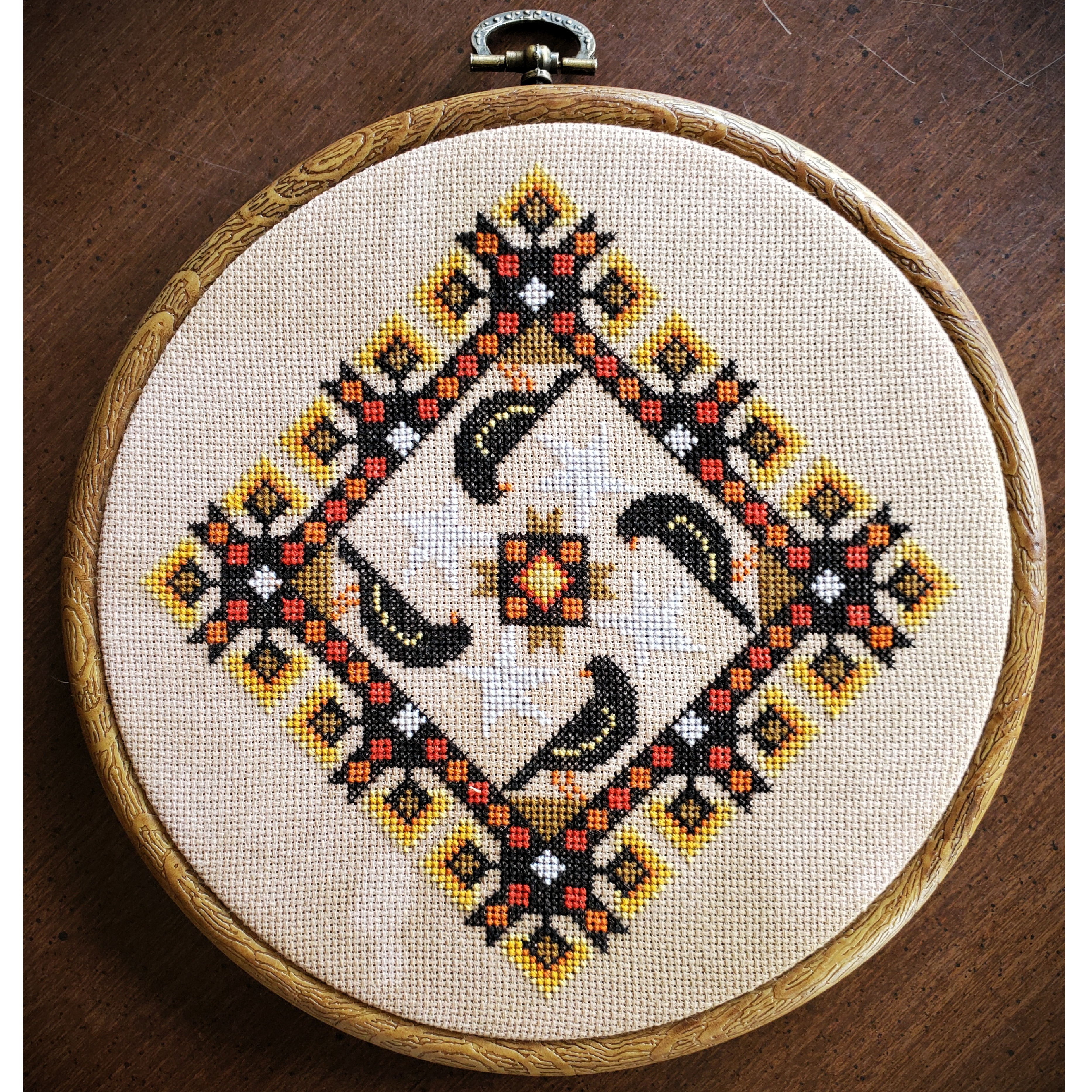 This cross stitch pattern from The Artsy Housewife featuring birds in a square design. The example uses DMC thread.