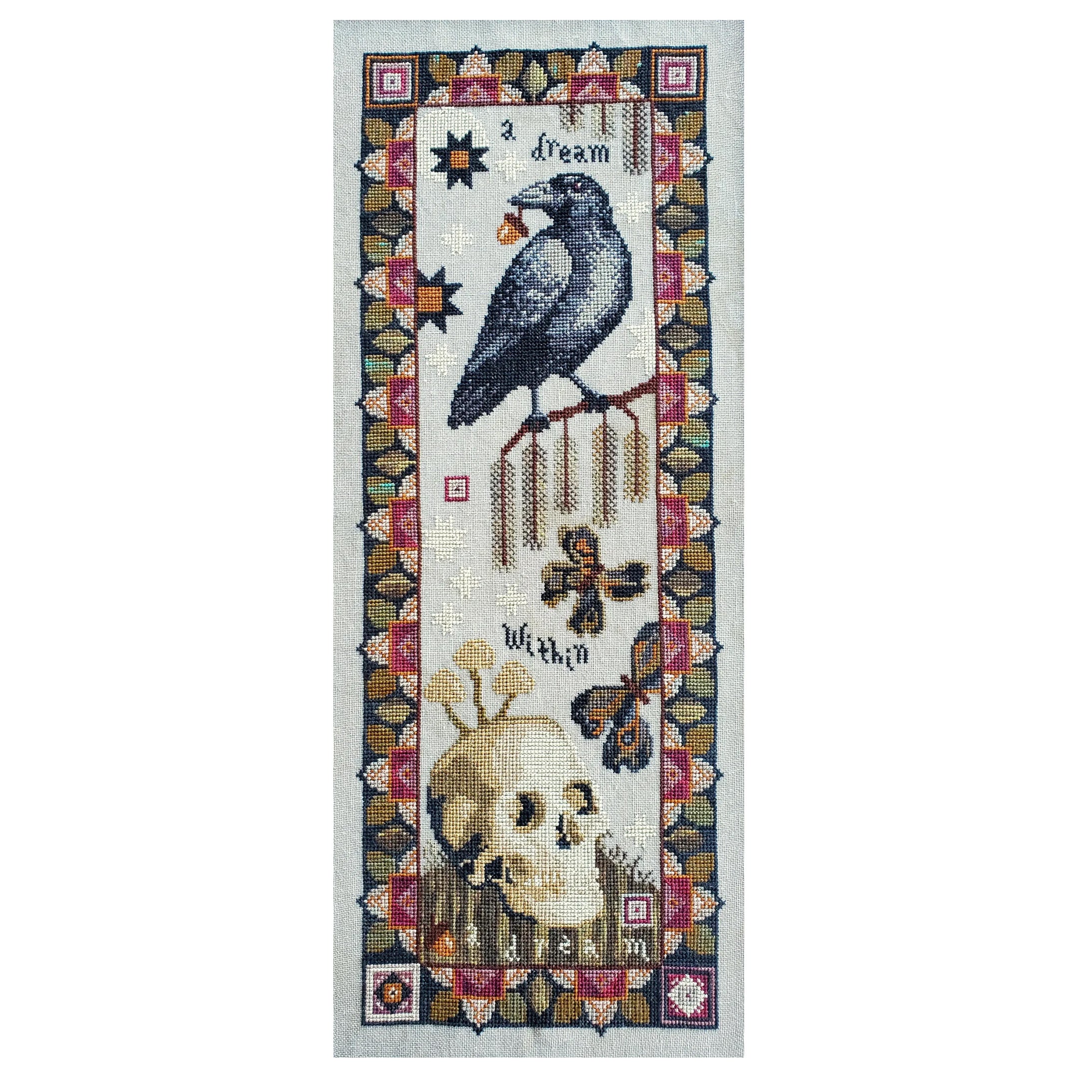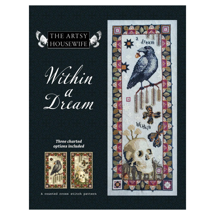 This is a printed cross stitch pattern by The Artsy Housewife. It includes three different chart options, each featuring either a crow, a skull, or both, surrounded by floral and butterfly motifs and text, all contained within a floral border. As stitched, this pattern uses Gentle Art Sampler Threads, Weeks Dye Works and DMC cotton flosses, and includes DMC conversions for all colors. The example was stitched on 32 count linen in the color "Wren" by Picture This Plus.