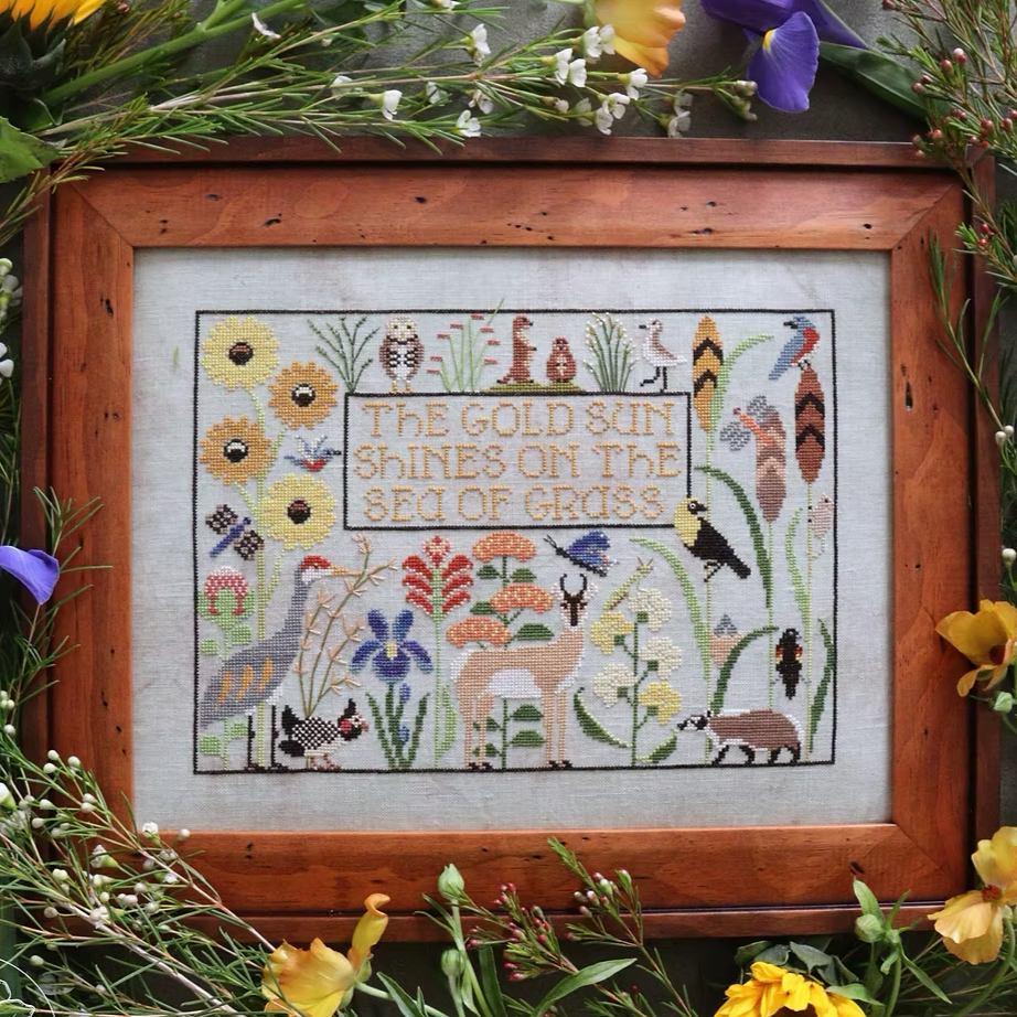 This is a printed cross stitch pattern by The Blue Flower. It features the amazing plants and animals of the grassland prairie and is a companion piece to Forest Home. The example as stitched uses DMC, Weeks Dye Works, and Classic Colorworks cotton flosses on 40 count Marbled Khaki linen from xJudesign. A full DMC conversion chart is included.