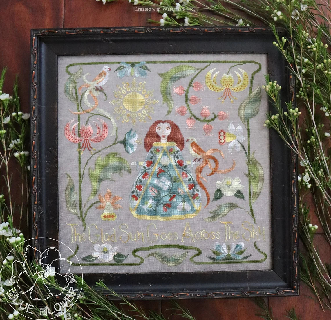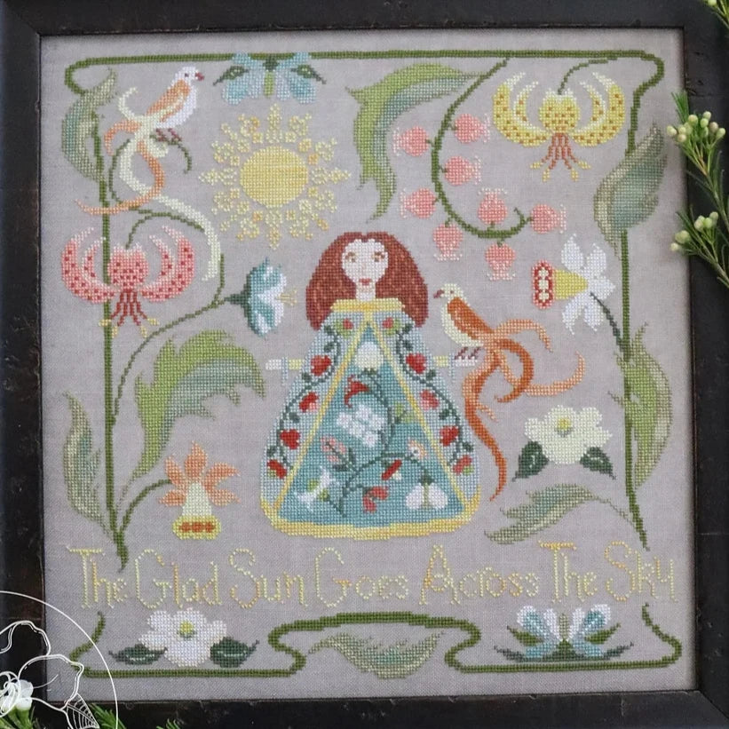 This printed cross stitch pattern by The Blue Flower features a lovely scene full of flowers and birds with "The glad sun goes across the sky". As stitched, it uses Classic Colorworks, Weeks Dye Works, and DMC floss.