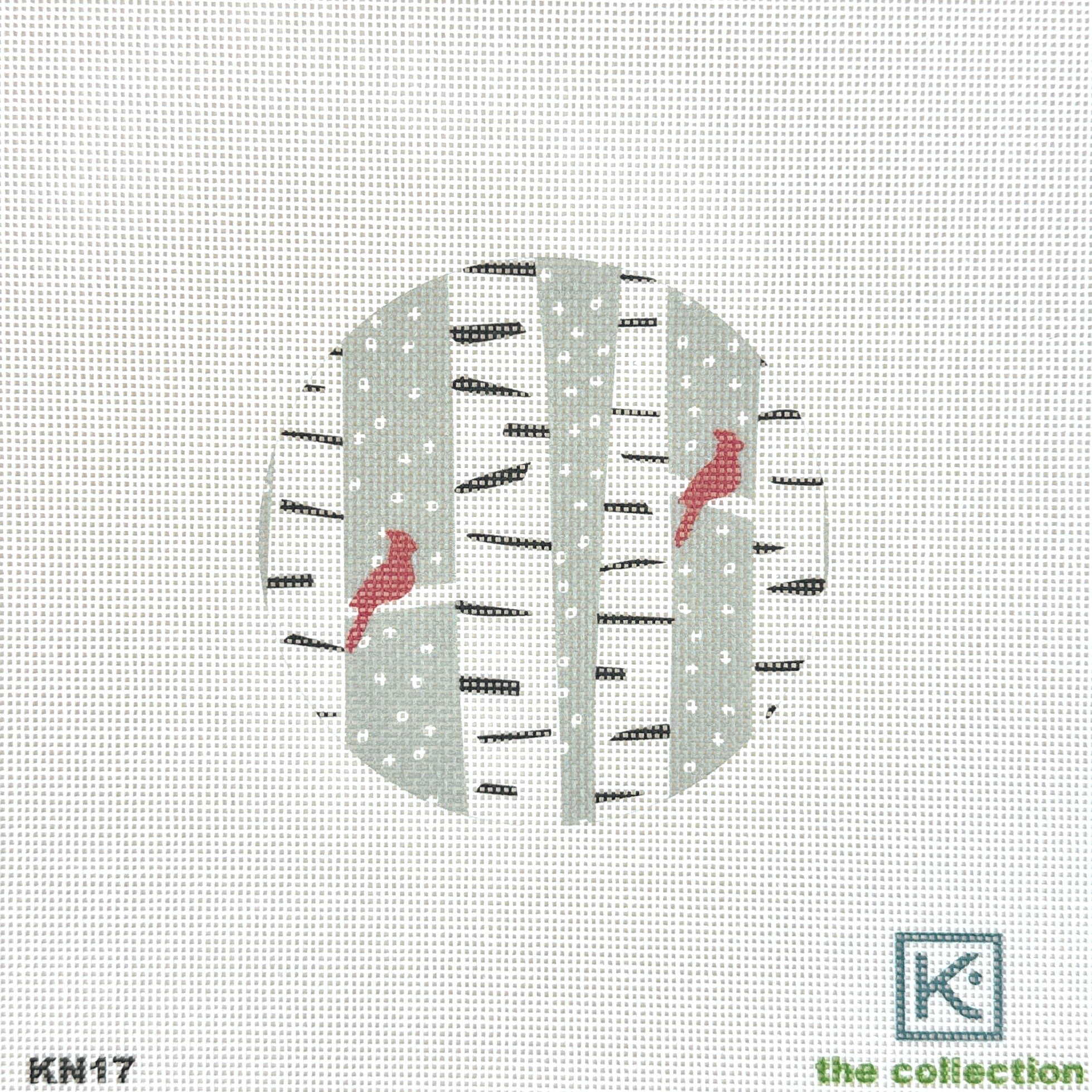 This is a printed needlepoint canvas by Kate Nelligan from The Collection Designs featuring a snow forest of birch trees with two red cardinals.