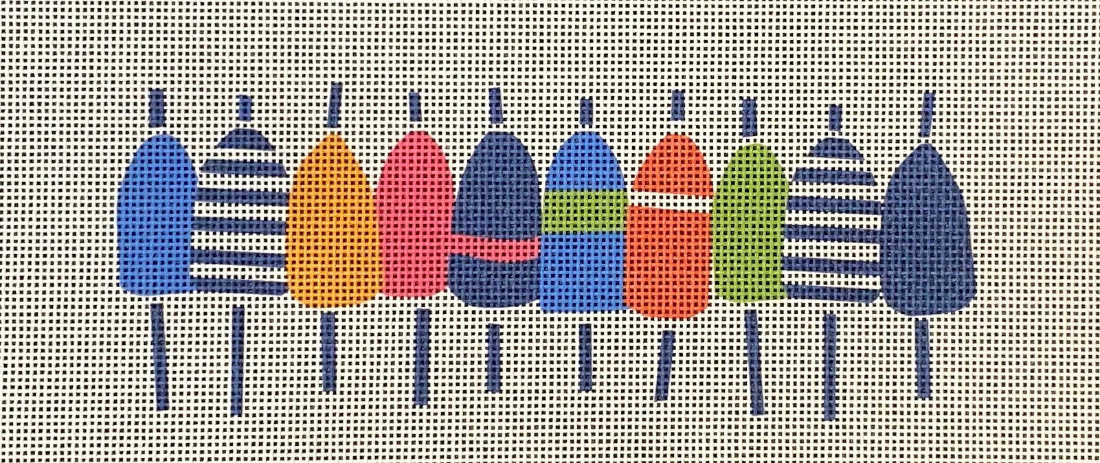 A beautiful printed needlepoint design by Kate Nelligan from The Collection. This canvas features an assortment of buoys arranged in a line.