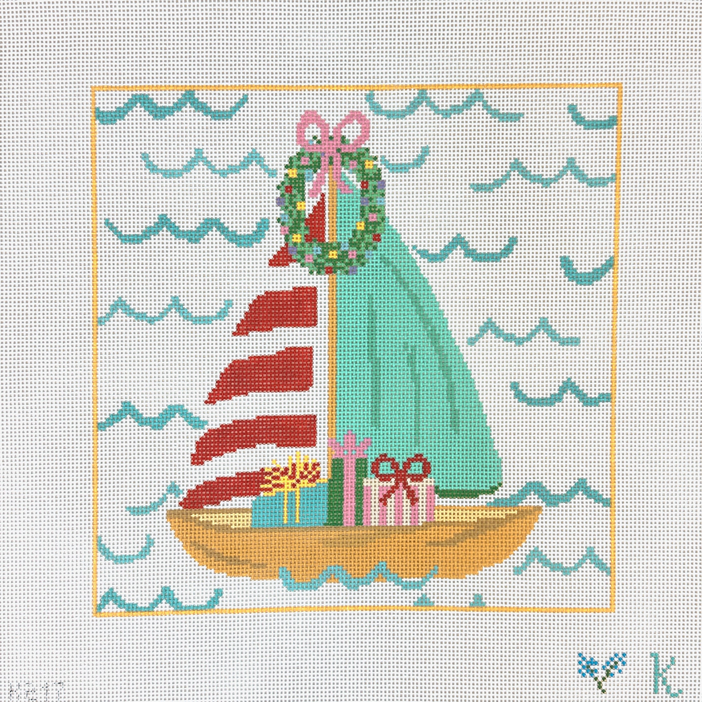 This is a hand painted needlepoint canvas by Kay Irby from The Collection Designs featuring a festive sailboat full of gifts.