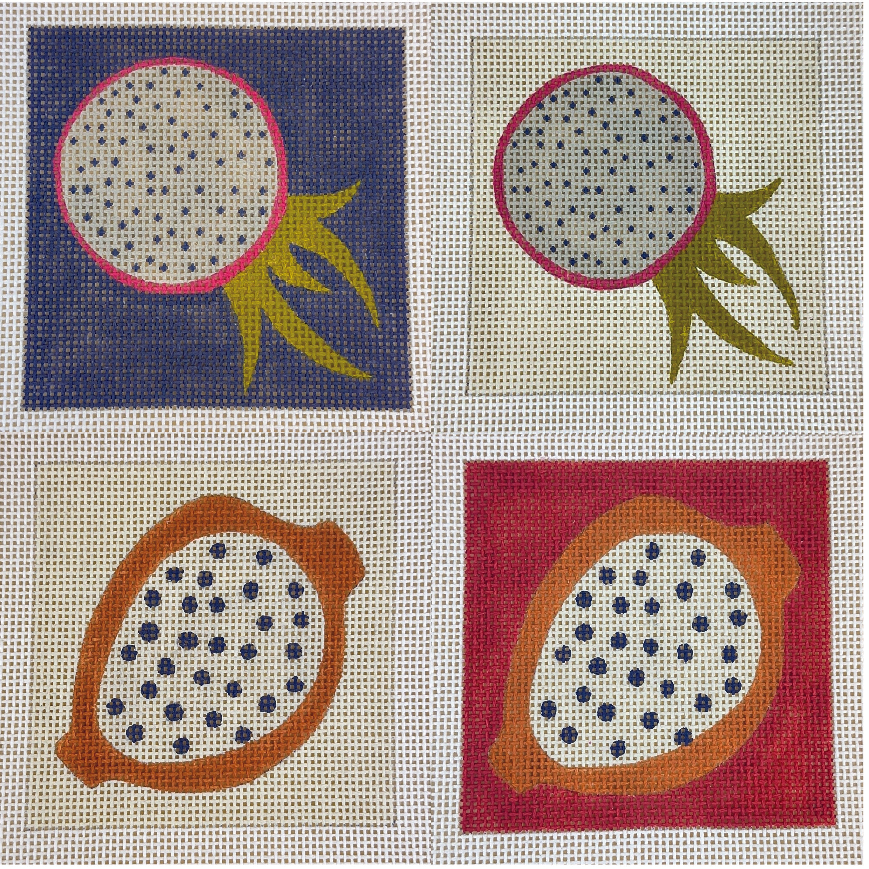 This set of 4 hand painted needlepoint canvases by Lizzie Clark for The Collection Designs feature pomegranates and dragon fruits..