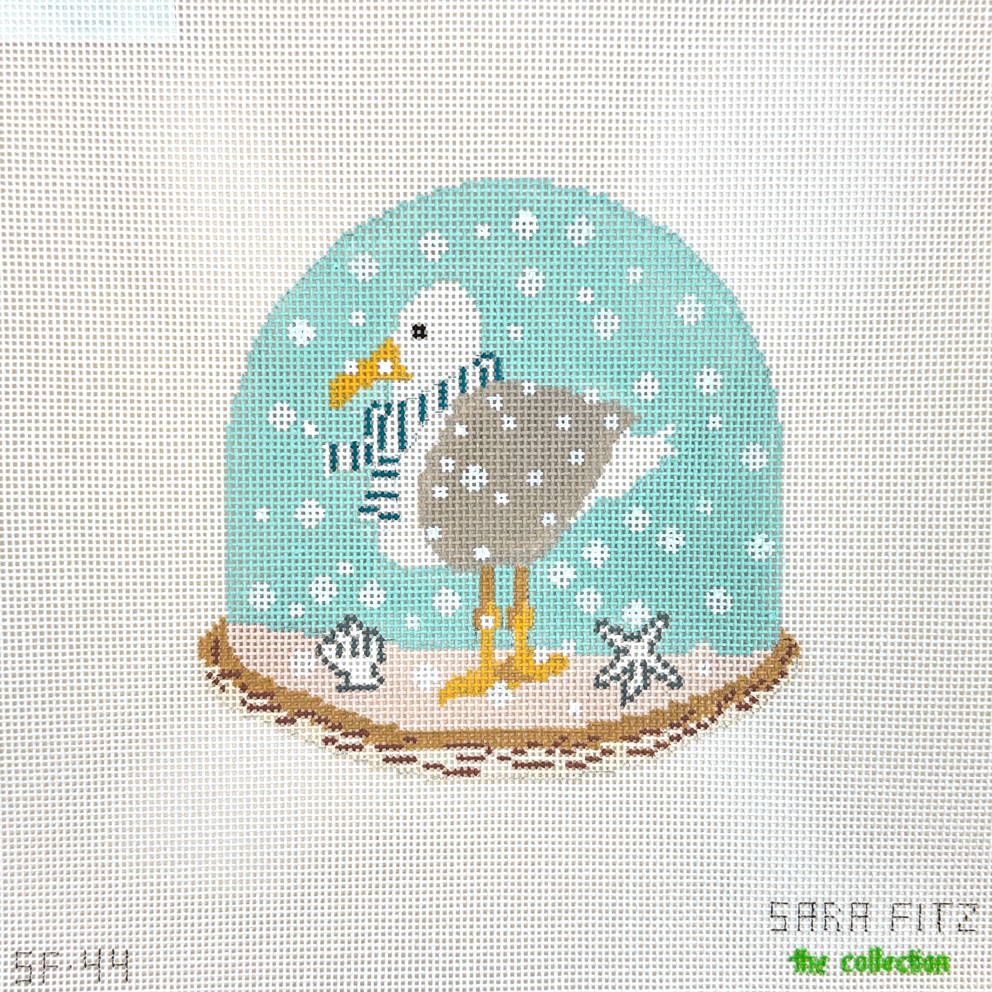 This is a hand painted needlepoint canvas by Sara Fitz from The Collection Designs featuring a seagull ready for winter while on a sandy beach.