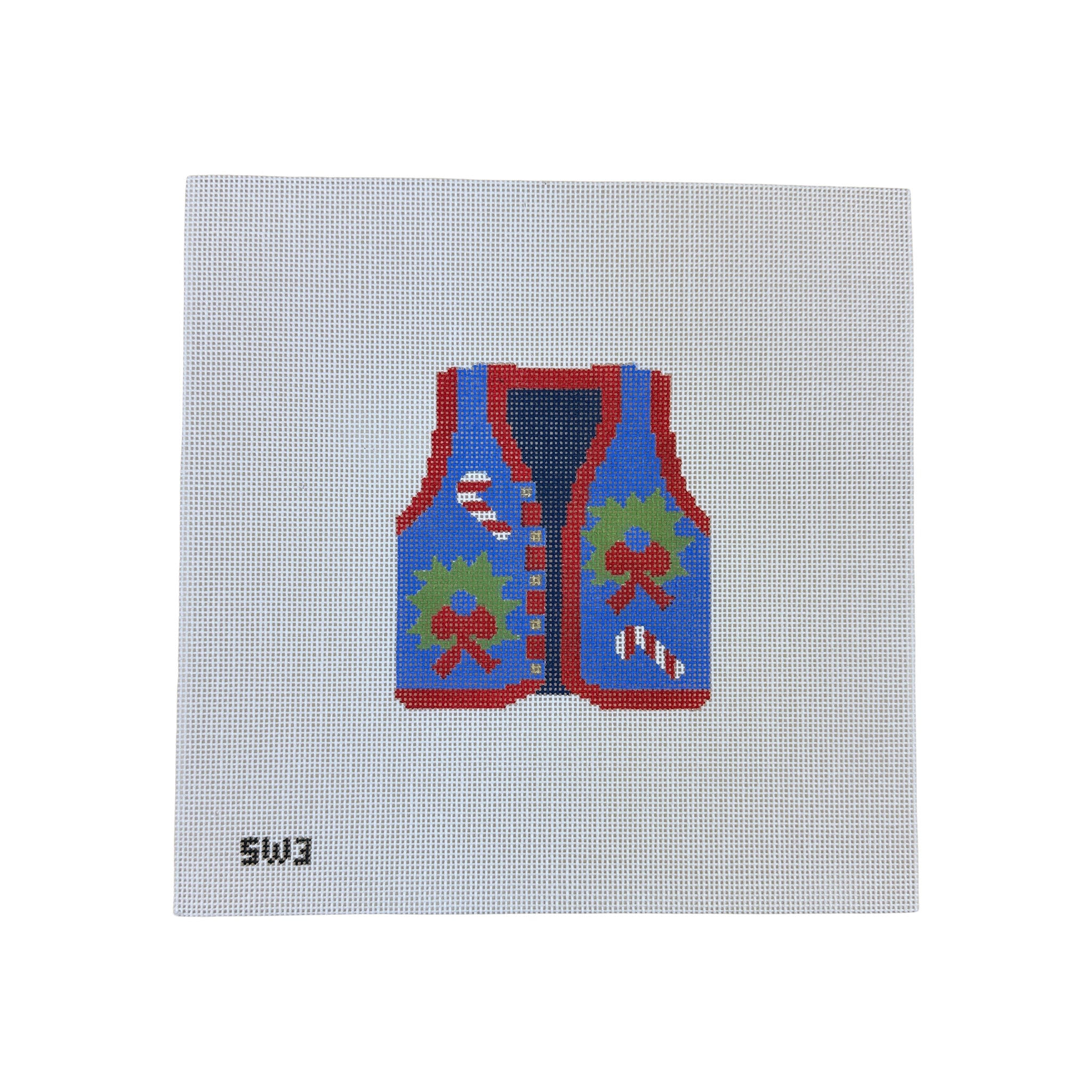 This hand painted needlepoint canvas by The Collection Designs features a Christmas sweater vest with wreaths and candy canes.