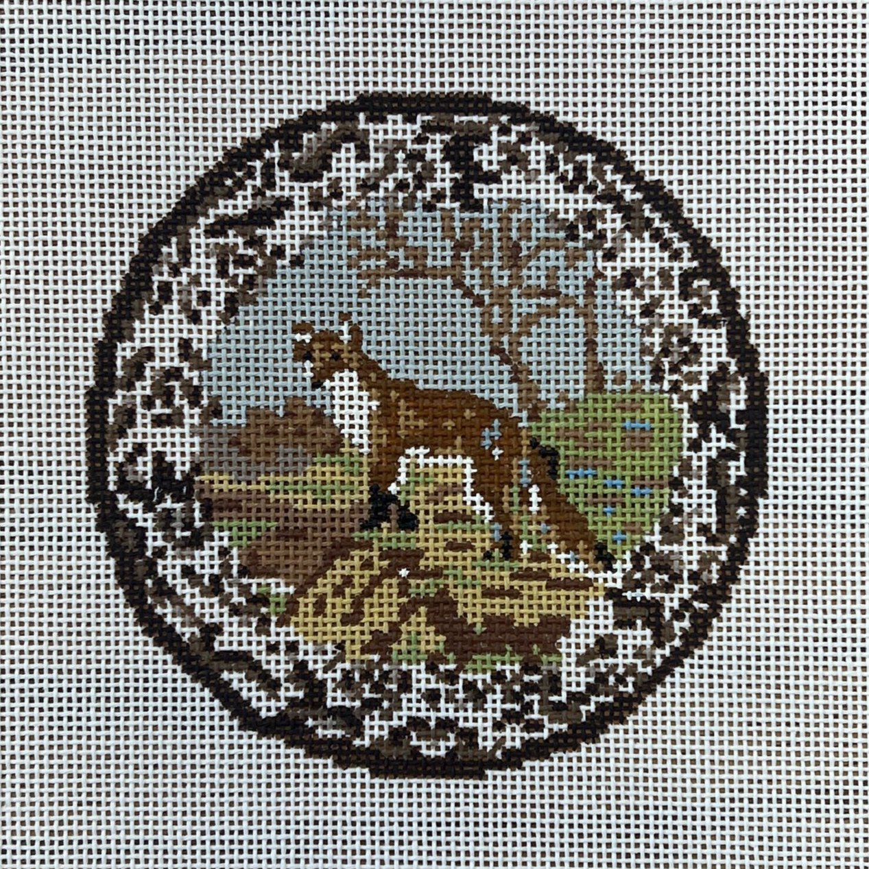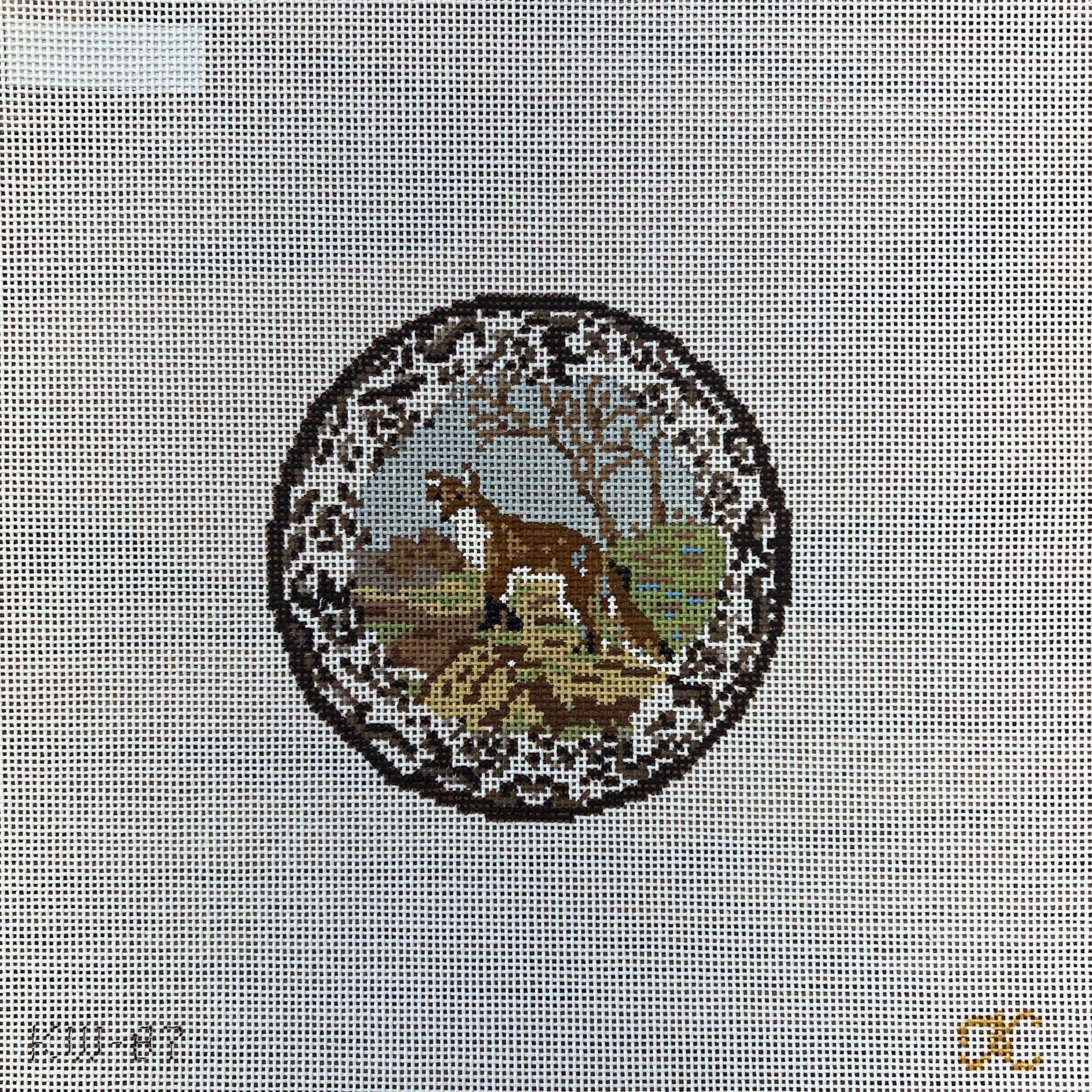 This hand painted needlepoint canvas by Kate Woodward for The Gingham Stitchery features a transferware plate inspired design with a beautiful fox.