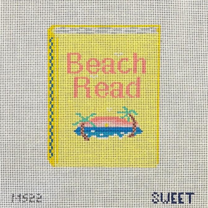 This hand painted needlepoint canvas by Maddie Sweets Designs for The Gingham Stitchery features a book with Beach Read on it.