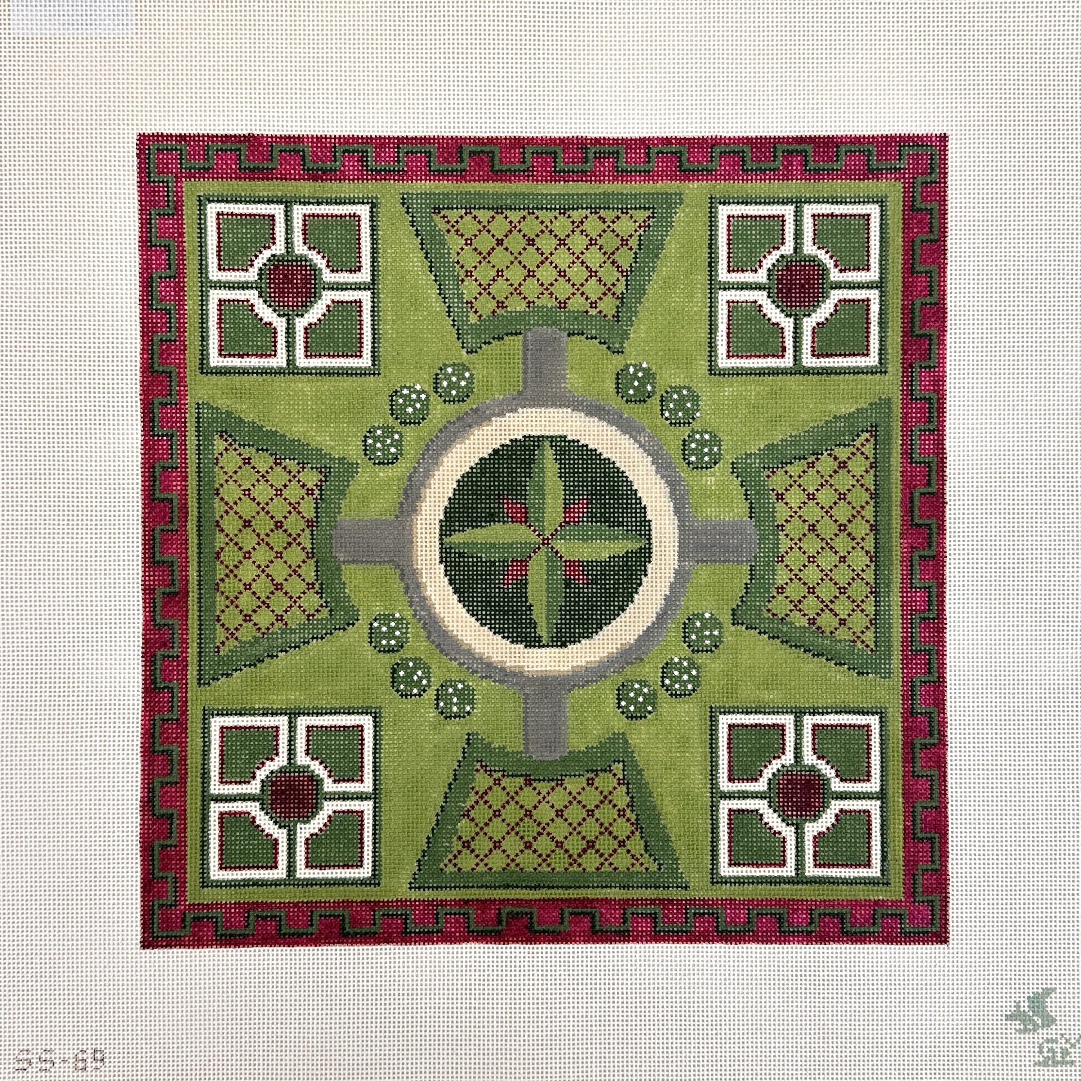 This is a needlepoint canvas from The Gingham Stitchery. It features a parterre decorated for the Christmas season.