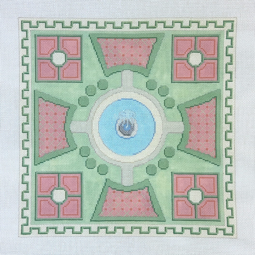This is a hand painted needlepoint canvas from The Squirrel and The Snail for The Gingham Stitchery. It features an overhead view of a parterre style garden.